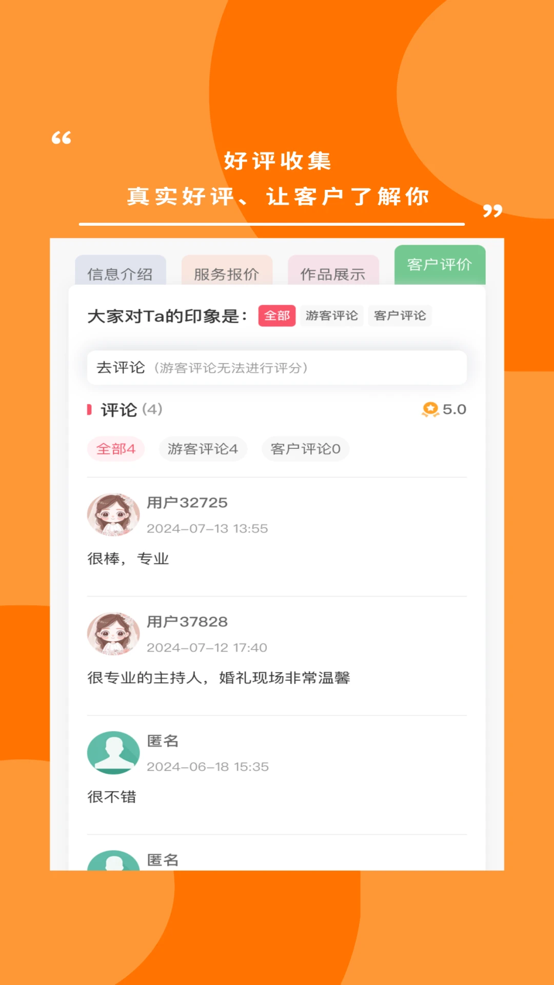 入驻商家需要通过平台的专业能力测试和服务质量评估,包括作品审核、服务案例考察等多个环节。平台建立了完善的评分体系,新用户可以通过查看商家评分和真实评价做出选择。这种严格的准入机制确保了平台上每个婚礼服务提供者都具备专业水准,让新人可以放心选择。