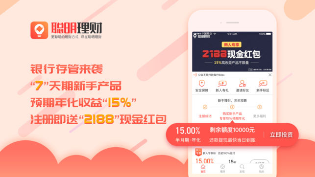 聪明理财作为一款专业的移动理财神器,为用户提供年化收益率9%-15%的高收益定期理财产品。新用户注册即可获得2188元现金大礼包,让您的理财之旅从第一天就收获满满。