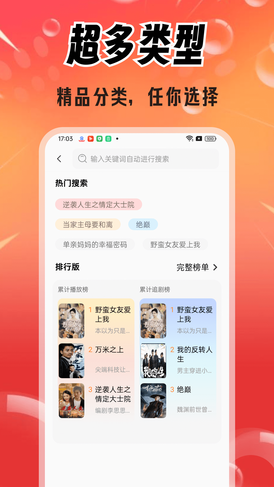 【热剧排行】我们实时追踪用户的观看数据,为你呈现最新最准确的热门短剧排行榜。这个榜单不仅反映了当下最受欢迎的短剧作品,还能帮助你发现正在流行的新剧趋势。你可以通过排行榜了解其他观众的选择,发现更多优质内容。榜单每天更新,确保你永远不会错过任何一部爆款短剧,让你轻松跟上追剧潮流。