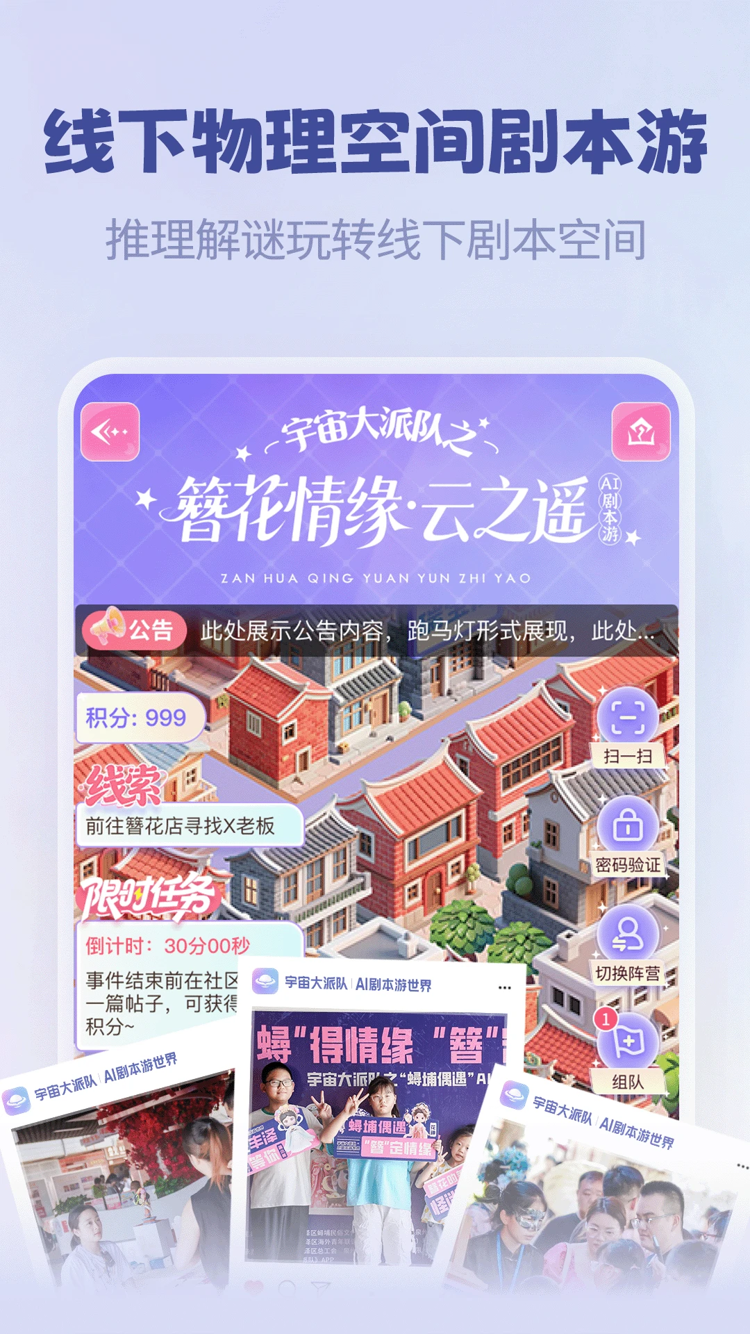 宇宙大派队致力于打造一个充满想象力的虚实交融世界,在这里,每一次登录都是一场全新的冒险,每一次互动都可能开启意想不到的故事。无论你是剧本杀爱好者、解谜游戏达人,还是单纯喜欢结交新朋友的社交达人,都能在这里找到属于自己的乐趣。快来加入宇宙大派队,开启你的次元冒险吧!