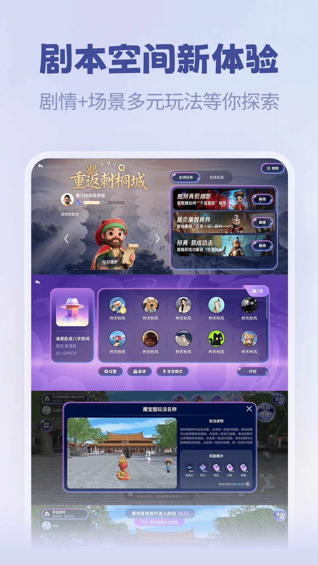【新版本核心亮点】带来更多惊喜体验!AI虚实社交剧本游空间现已全面升级,即日起实景剧本游欢乐开启!我们精心打造了近200场次剧本游活动,覆盖泉州中山南路、真武庙、蟳埔村、清源山等多个特色场景,同时还将逐步扩展到全国各大景区。40余条精彩剧情线等你探索,从商贸争斗到爱国风云,从簪花浪漫到平行时空穿越,再到武侠修仙世界,多元主题元素满足不同玩家的喜好。更有限定剧情任务、刺激的阵营PK活动,让你轻松组队结识志同道合的剧本搭子,在陌生人社交中收获意想不到的乐趣。