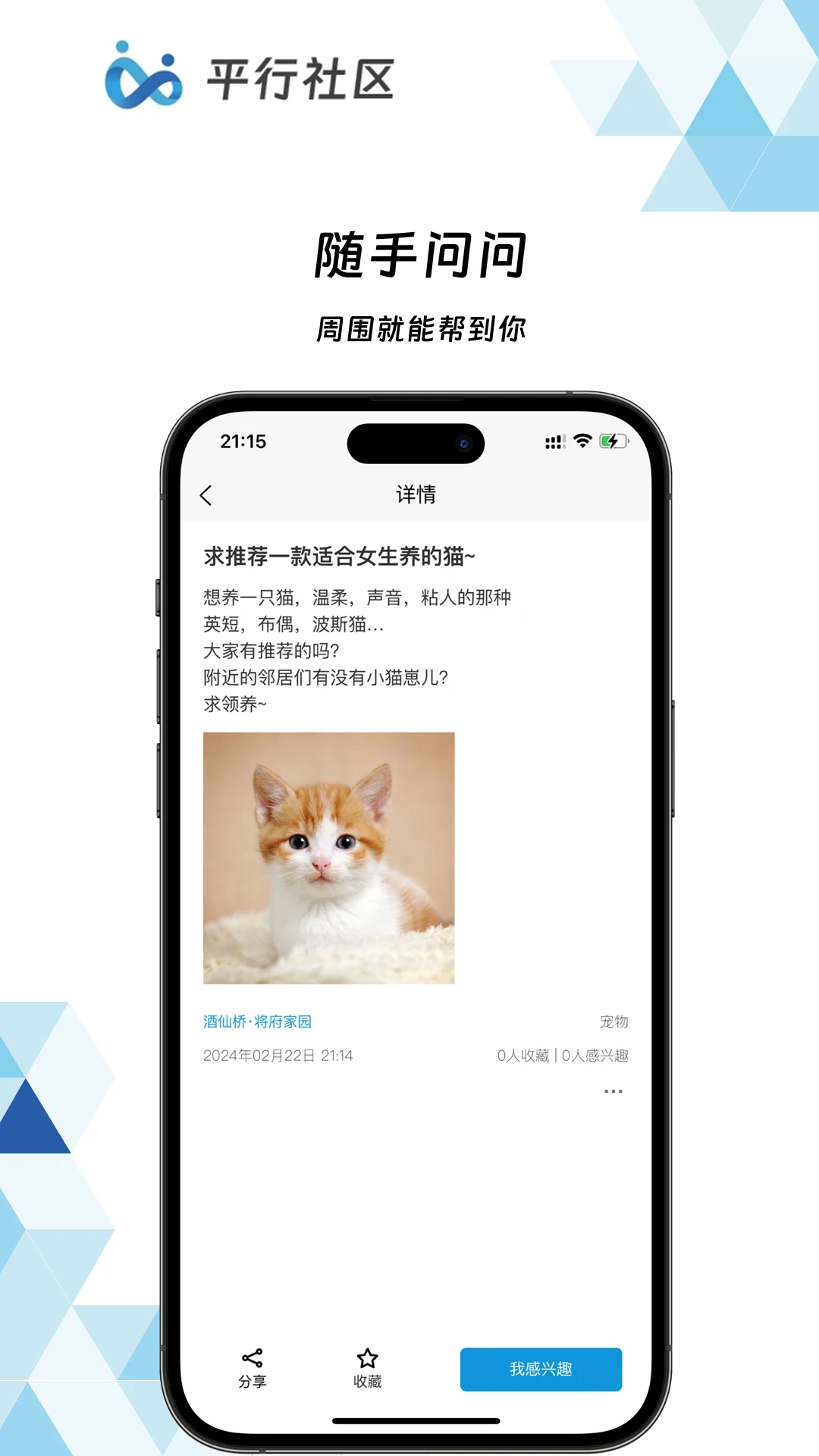 平行社区是一个开放、便捷、温暖的生活信息分享平台,致力于为用户打造一个真实、高效的本地生活圈。在这里,你可以轻松获取或分享各类生活信息,无论是艺术展览、亲子活动、闲置交易,还是社区公告、寻物启事,都能快速找到志同道合的伙伴。平台汇聚了海量本地生活资讯,帮助用户发现身边的美好,让生活更加丰富多彩。