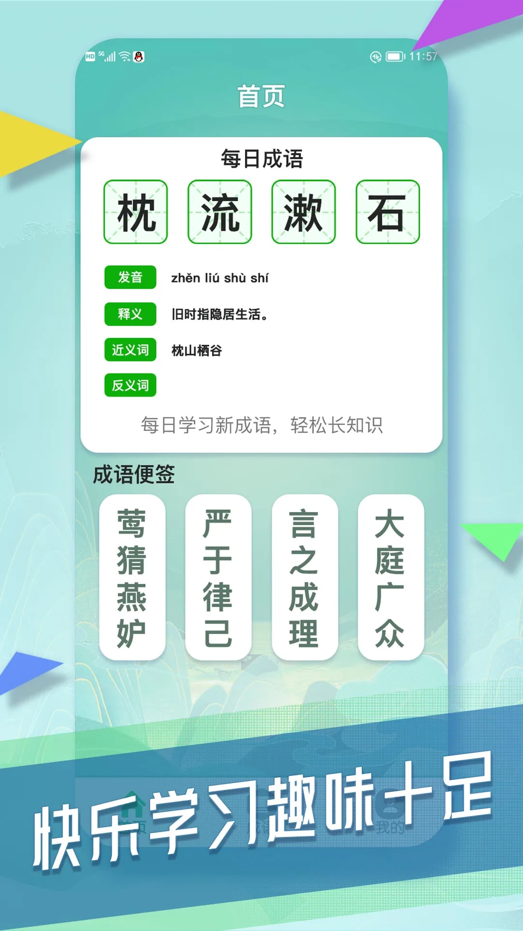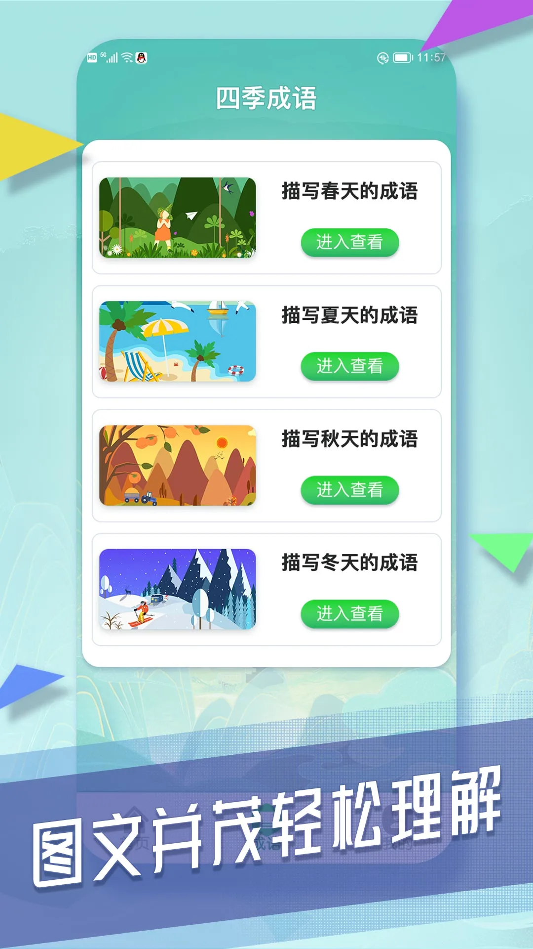分别涵盖了四个季节中多个不同的成语,每一个都有详细的释义,为记忆成语更添助力!该模块特别设计了季节主题界面和背景音乐,营造沉浸式学习体验。用户可以通过季节变化感受成语背后的文化内涵,同时系统会根据当前季节智能推荐相关成语,让学习内容更具时效性和趣味性。