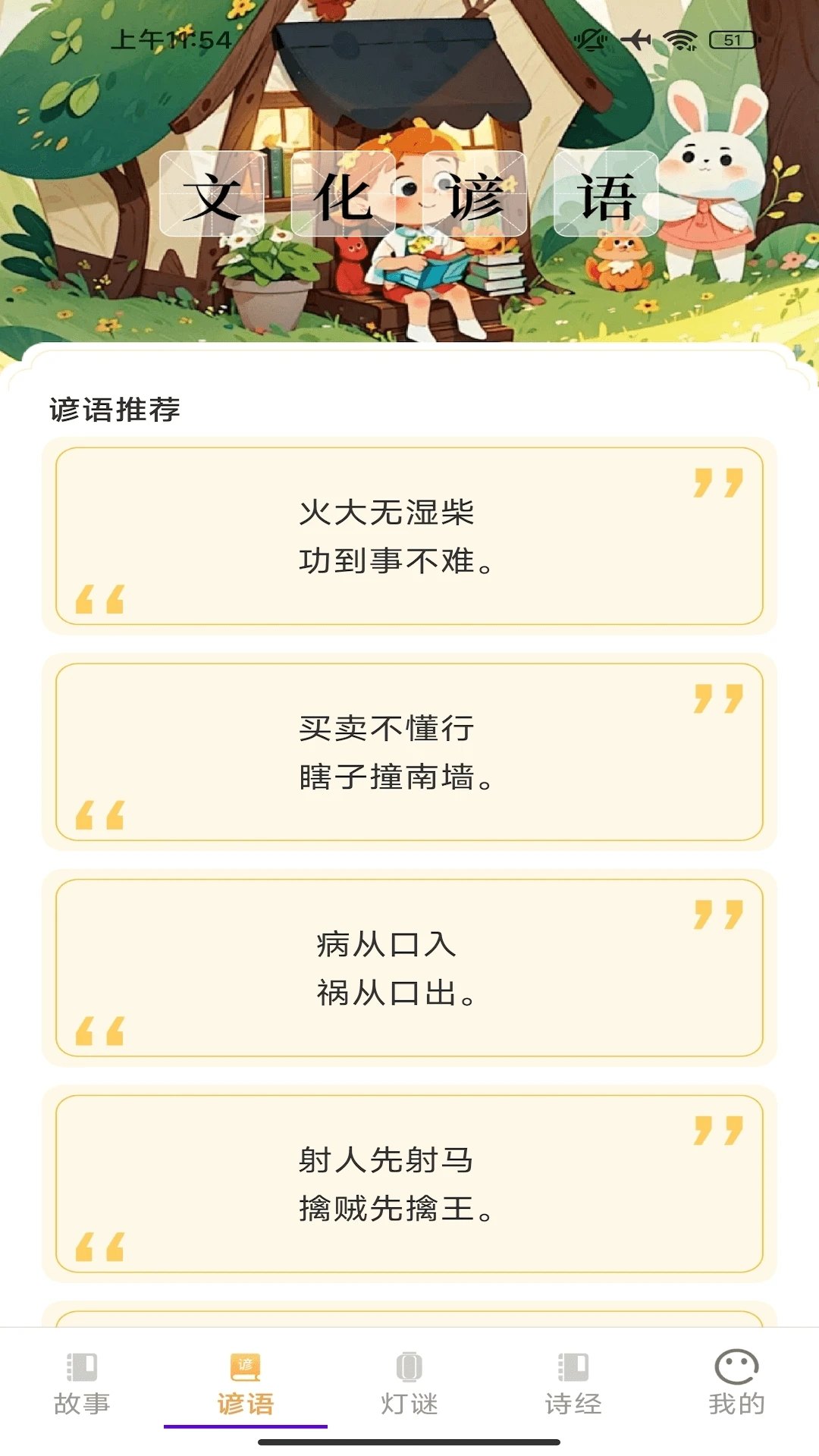 谚语板块汇集了古今中外的智慧结晶,从中国民间谚语到西方谚语大全,内容丰富多样。我们不仅提供谚语的文字解释,还配有相关的历史背景和文化内涵讲解。通过生动有趣的动画和实际应用案例,让您轻松理解这些古老智慧的现实意义。此外,我们还设计了谚语接龙游戏和每日一句功能,帮助您在娱乐中积累知识,提升语言表达能力。