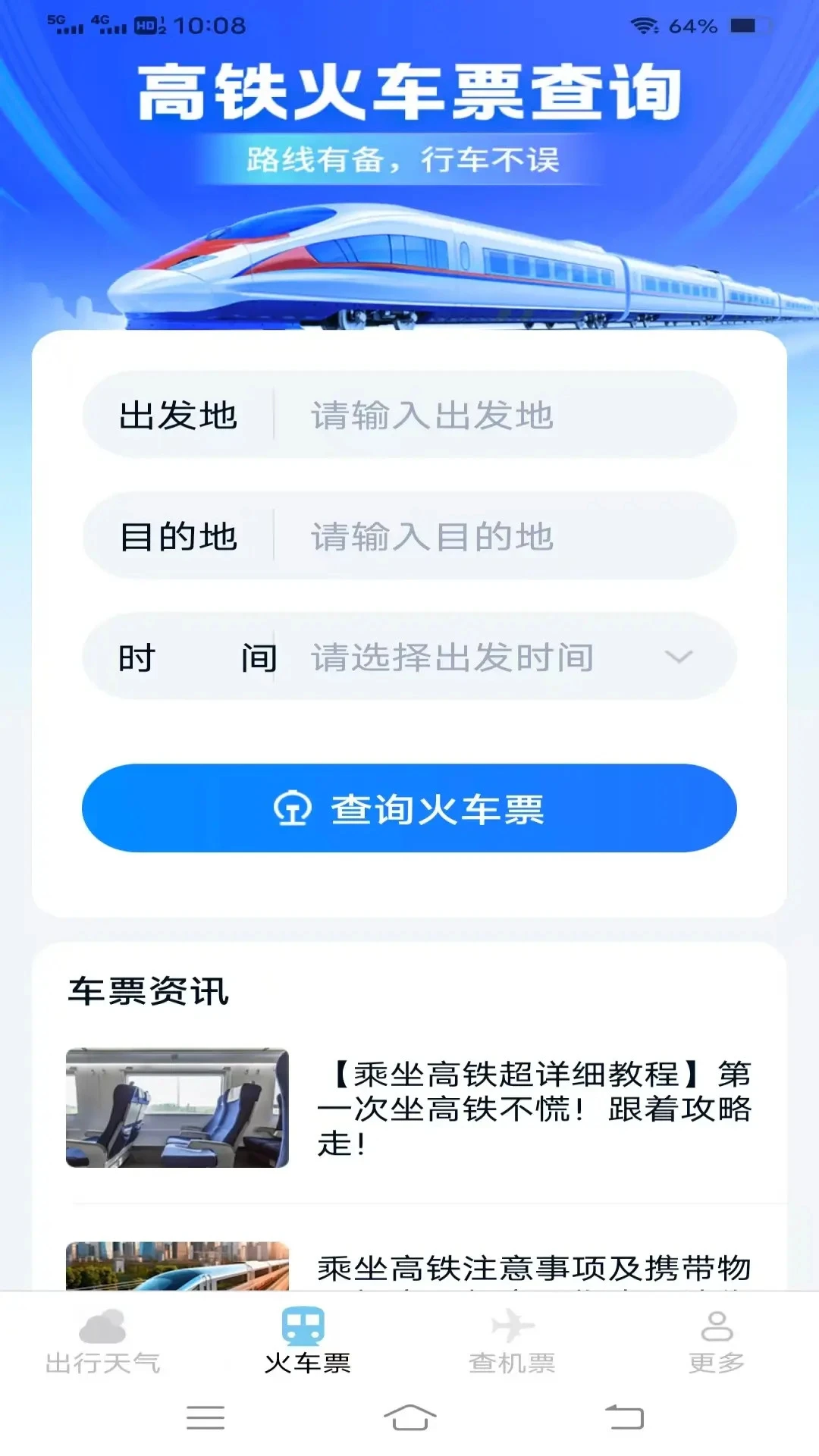 【火车票】应用内置强大的高铁火车票查询功能,支持全国范围内的车次搜索。您可以自由选择出发日期,系统会自动筛选出最合适的车次,并提供详细的票价信息、座位余量和乘车时间。无论是商务出行还是休闲旅游,都能快速找到最适合的出行方案。