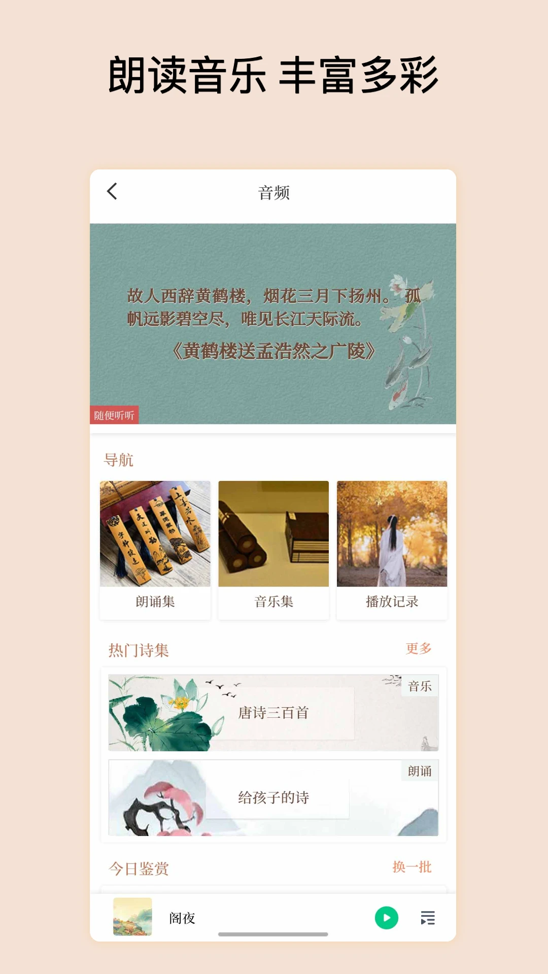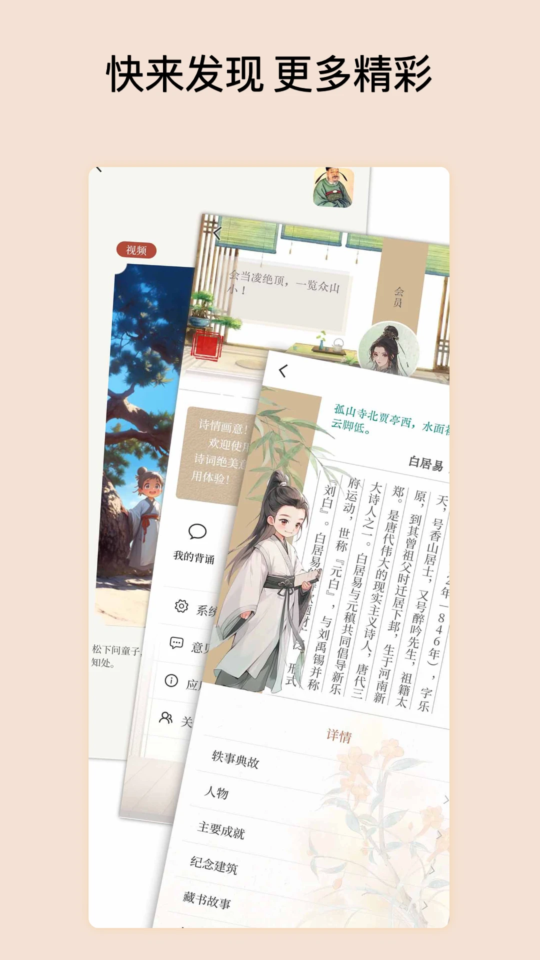 我们精心准备了海量优质内容:从《诗经》的质朴纯真,到唐诗的雄浑壮阔,再到宋词的婉约细腻;从山水画的空灵意境,到花鸟画的生动传神。每日更新的内容将带你领略中华文化的博大精深,让诗意融入生活的每个角落。
