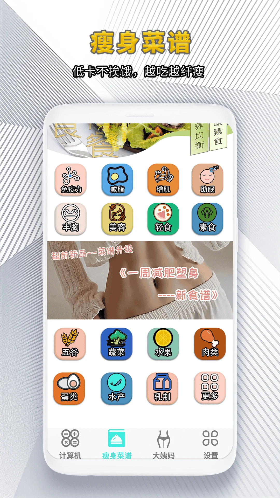 除了专业的计算功能外,这款应用还特别加入了健康生活辅助功能。瘦身菜谱功能提供科学搭配的三餐食谱,每一口都精准控卡,让减脂过程不再缺乏营养。保姨级大姨妈提示功能则能智能预测生理周期,从初潮到成熟期全程陪伴,让女性用户告别措手不及的尴尬时刻。