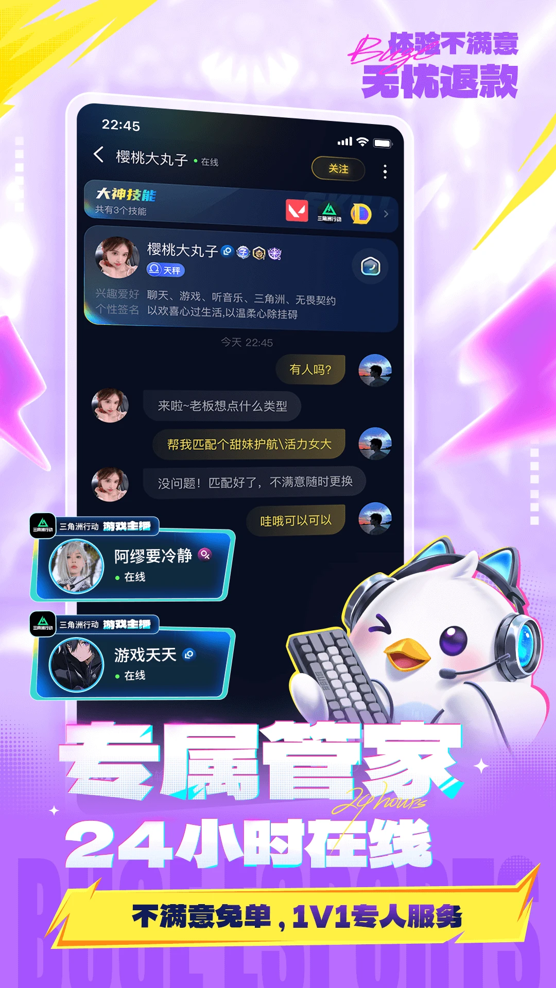 不鸽电竞,作为全国领先的端游开黑社交平台,致力于为玩家打造极致的游戏社交体验。这款专为端游爱好者设计的APP,不仅提供高质量的陪玩服务,更创造了一个充满活力的游戏社交圈。在这里,你可以找到志同道合的队友,体验酣畅淋漓的开黑乐趣,感受青春热血的竞技魅力。