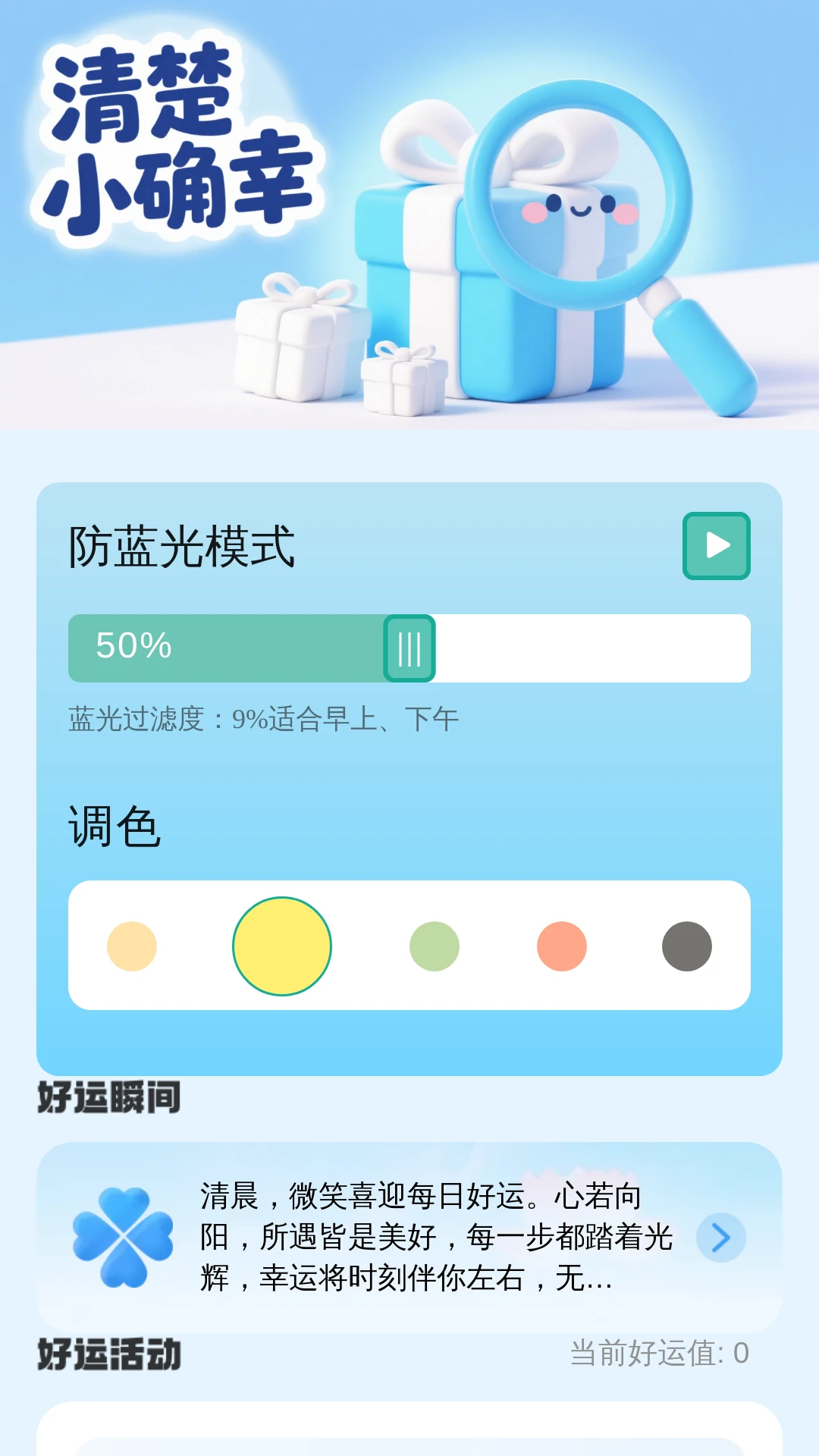 结合护眼科技与生活美学,提供防蓝光模式保护视力,同时捕捉日常中的美好瞬间。内置"好运瞬间"功能会随机推送暖心小贴士和正能量内容,"好运活动"则推荐周边有趣体验。用户可以记录每天的小确幸,建立专属的幸福日记,培养积极乐观的生活态度,从细微处发现生活的闪光点。