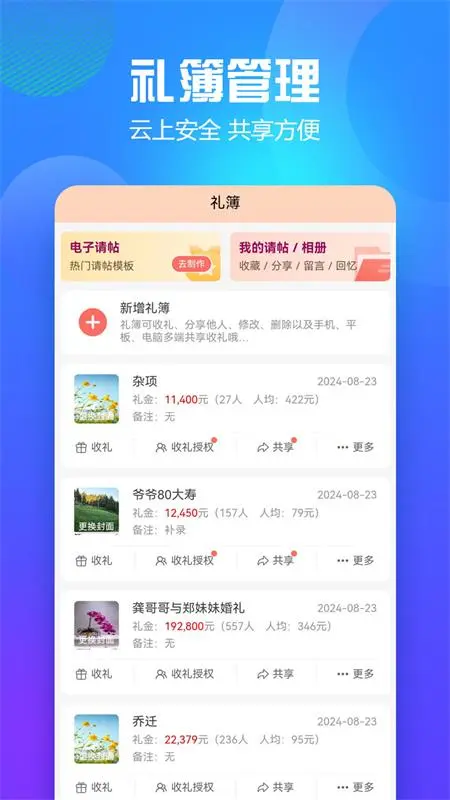 这款软件是一款功能强大的电子请帖和人情往来管理工具,为用户提供便捷的社交礼尚往来解决方案。它支持免费制作精美的电子请帖和请柬,同时具备人情往来记录功能,帮助用户轻松管理送礼和收礼明细。通过云端加密存储技术,确保数据安全可靠,并支持手机、平板、电脑多端同步使用,还能实现数据共享,让亲友间的互动更加高效便捷。无论是婚礼、生日宴还是其他重要场合,都能通过这款软件实现高效管理和温馨互动。