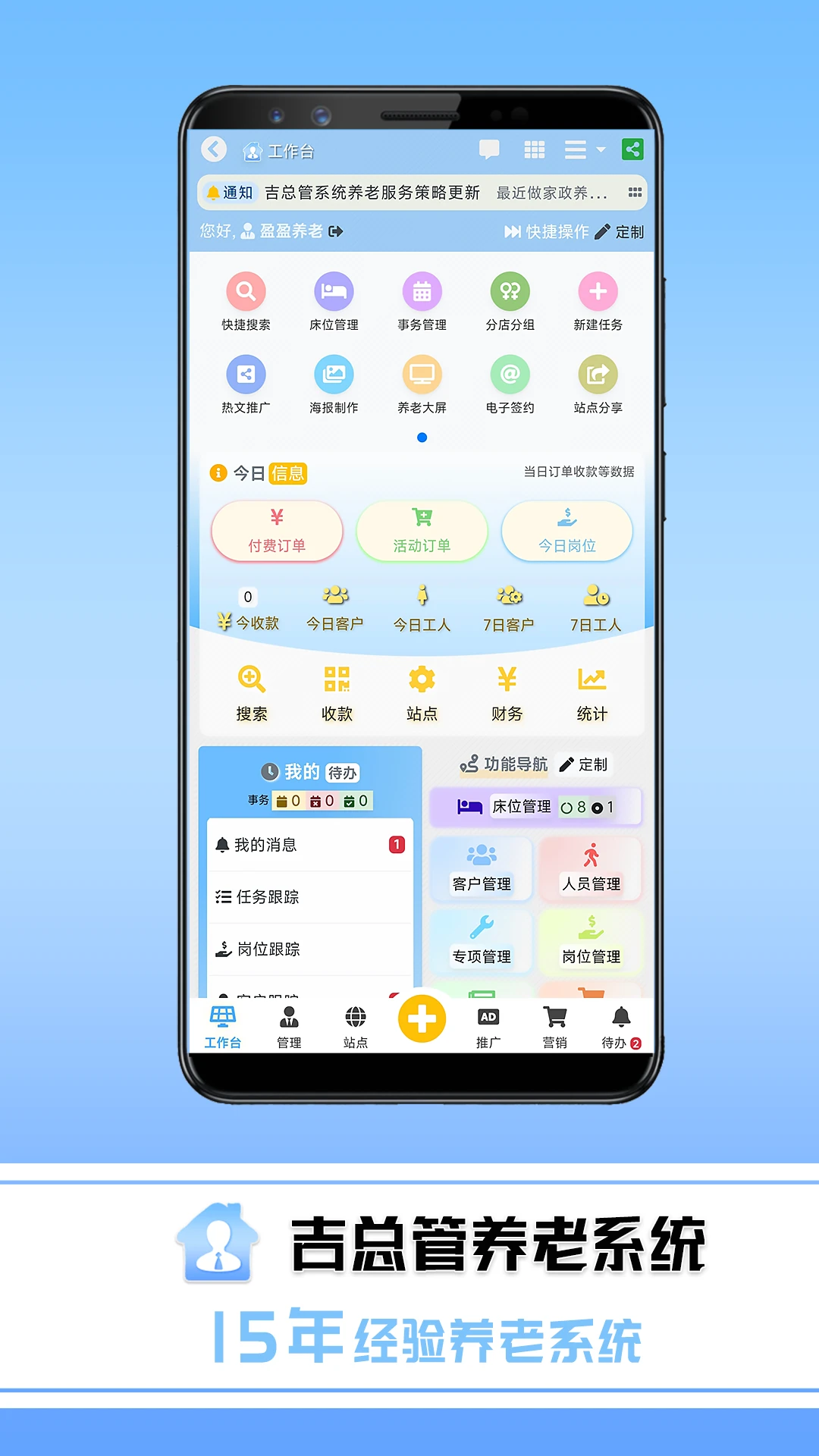吉总管是一款拥有10多年行业经验的专业养老系统,专为养老企业量身打造。它全面覆盖养老行业的各类运营模式,包括社区养老、机构养老、居家养老等多样化场景,同时支持陪护陪诊、适老化改造、智慧养老等创新服务。系统还提供养老全行业解决方案,如养老院管理、智慧养老机构一体化运营、养老护理站管理等,助力企业实现低成本、高效率的数字化运营。通过吉总管,养老公司不仅能大幅提升管理效率,还能显著增强市场推广能力,是推动养老业务发展的强大工具。