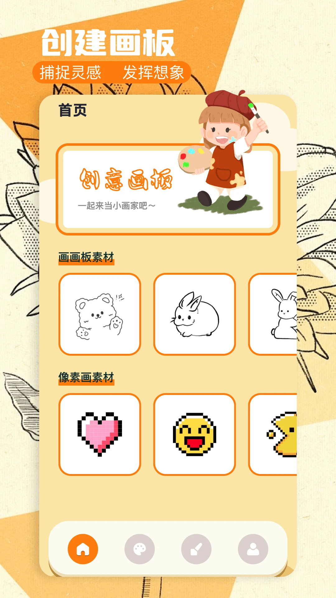 proate绘画一款手机创意画板,“捕捉灵感发挥想象”创作属于你的专属画作,应用内画笔、橡皮、颜色任你选择、快来创作属于你的专属吧!