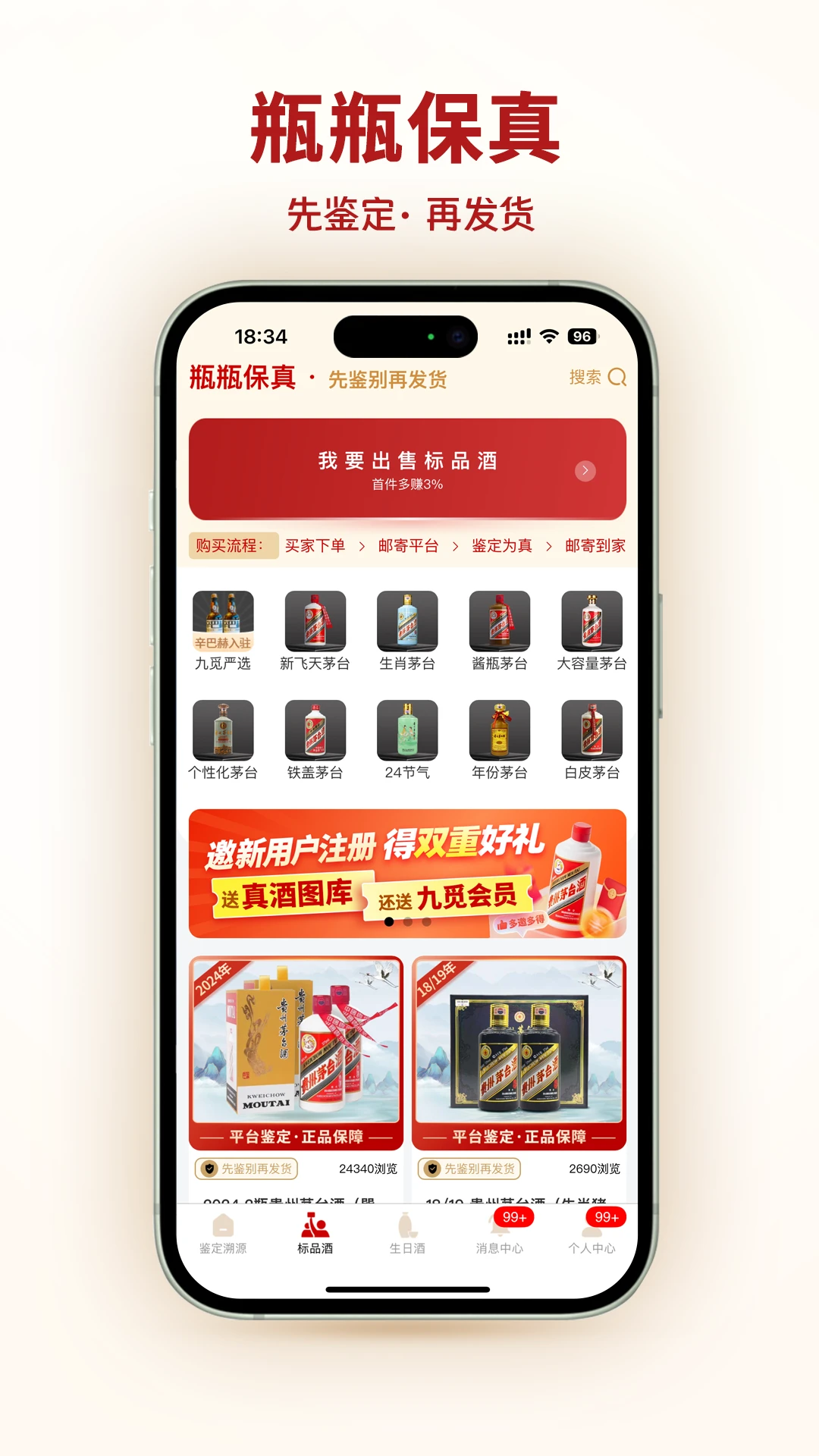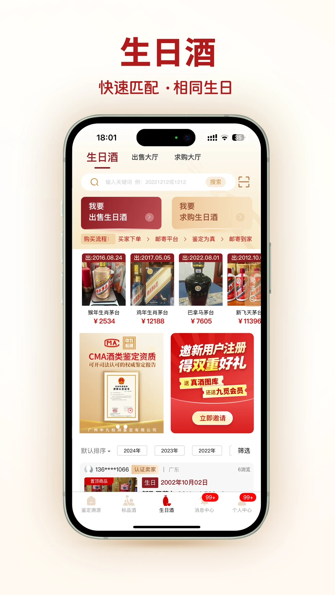九觅国香APP是专为茅台爱好者打造的专业服务平台,集生日酒交易、真伪鉴定、溯源查验、喷码识别等多项功能于一体。新增AI智能识别功能,支持喷码图像拍照校正,一键判断是否合规。平台已上线50万+正品茅台图谱,覆盖历年批次,支持图像对比查询,辅助快速辨真伪。更有“生日酒专区”,按纪念日匹配专属茅台佳酿,赋予每瓶酒独特意义。