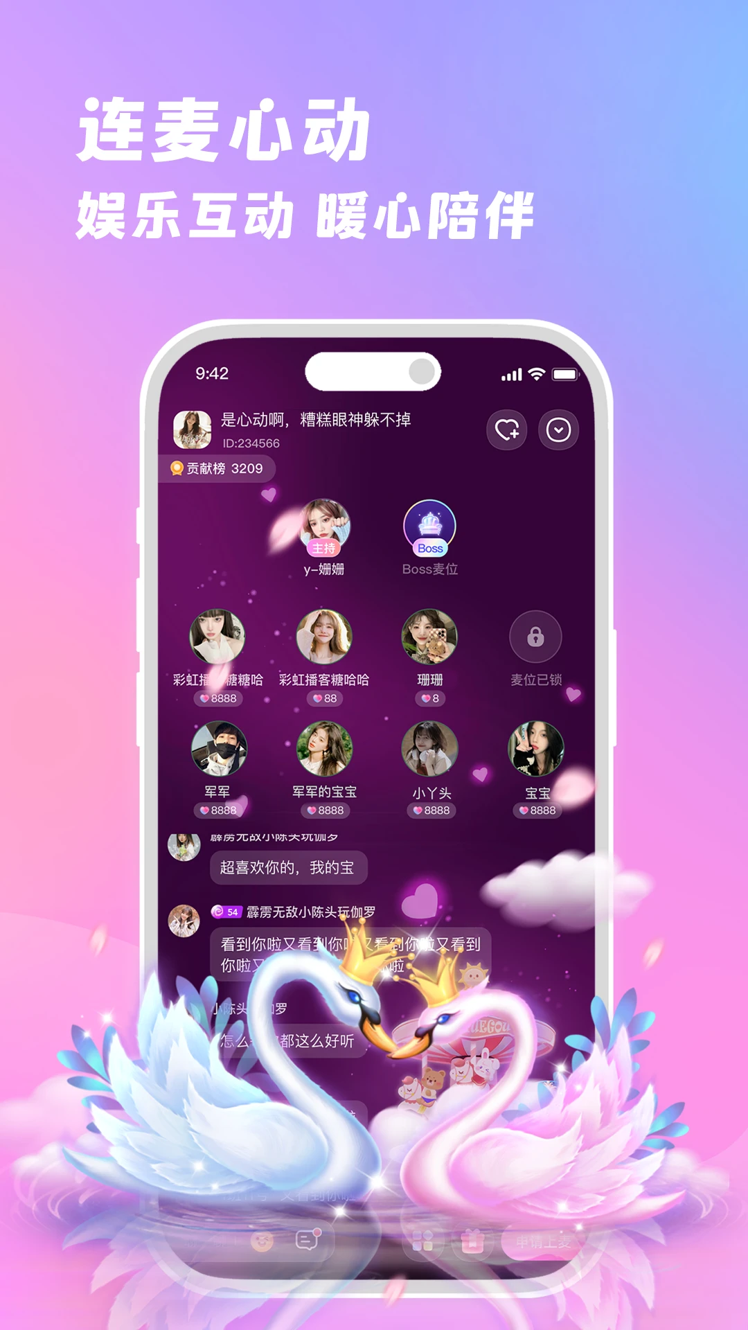 多人语音聊天室扩列交友,随时结识更多陪伴好友,连麦颜值女神,派对狂欢,多种互动玩法等你来体验!