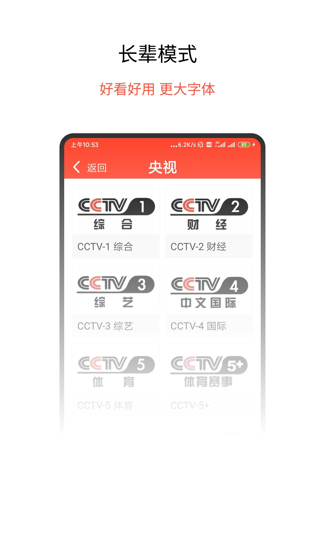 手机电视直播是一款让长辈可简单操作就观看到齐全高清免费电视直播软件,随时随地用手机看电视,海量影视、新闻、体育、电视节目资源抢先看!大字版一键开启关怀模式,关爱长辈老人从我们做起!