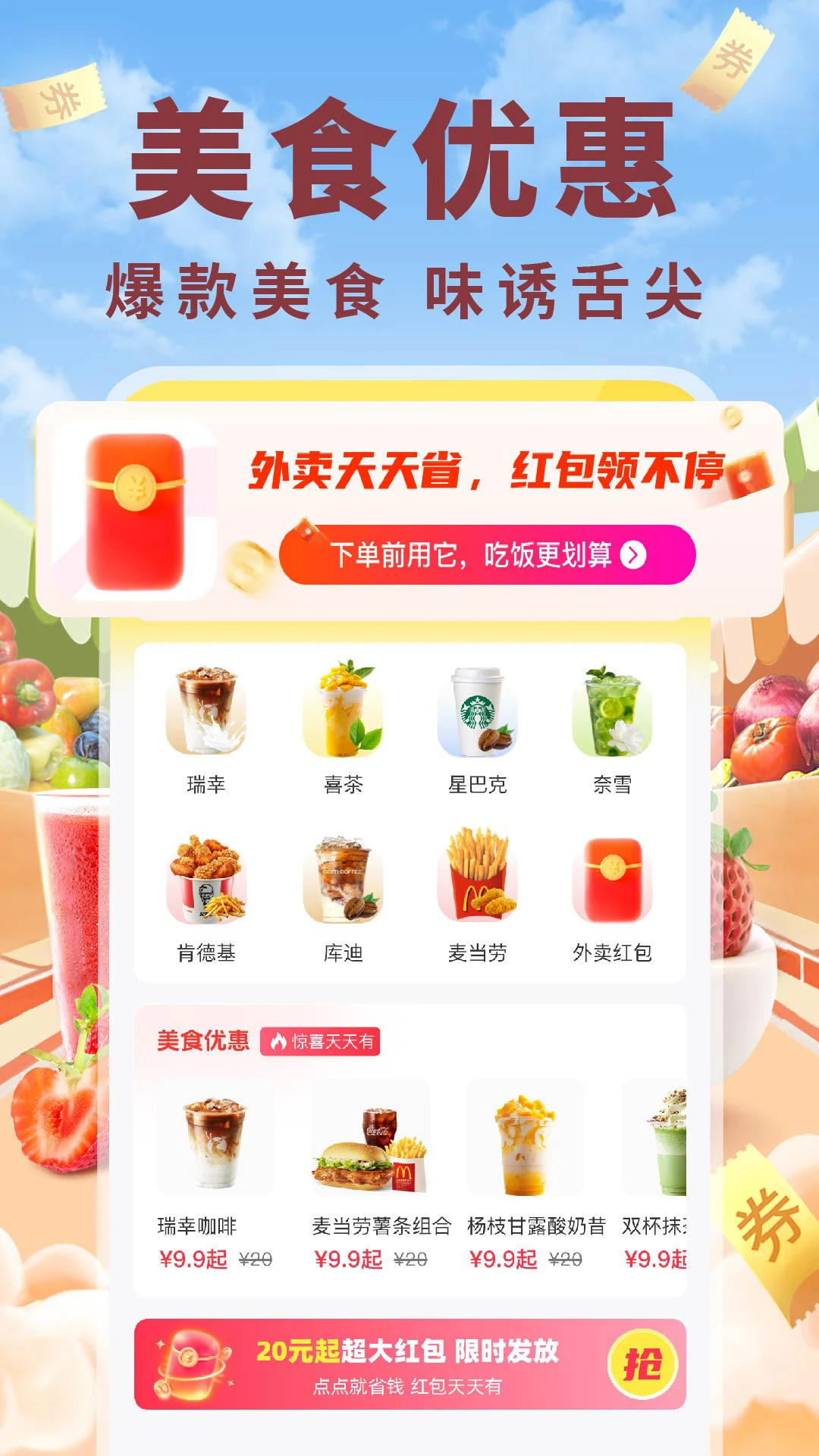 -海量优惠随心领:优惠任你拿。早餐的豆浆油条,晚餐的火锅烧烤,都能帮你省下真金白银。