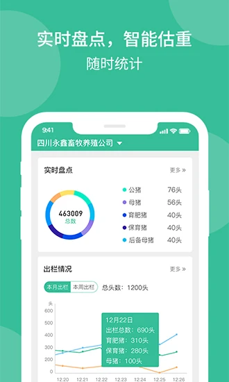 实时数据统计:自动生成猪只存栏、饲料消耗、生长周期等关键指标报表,辅助精准决策。