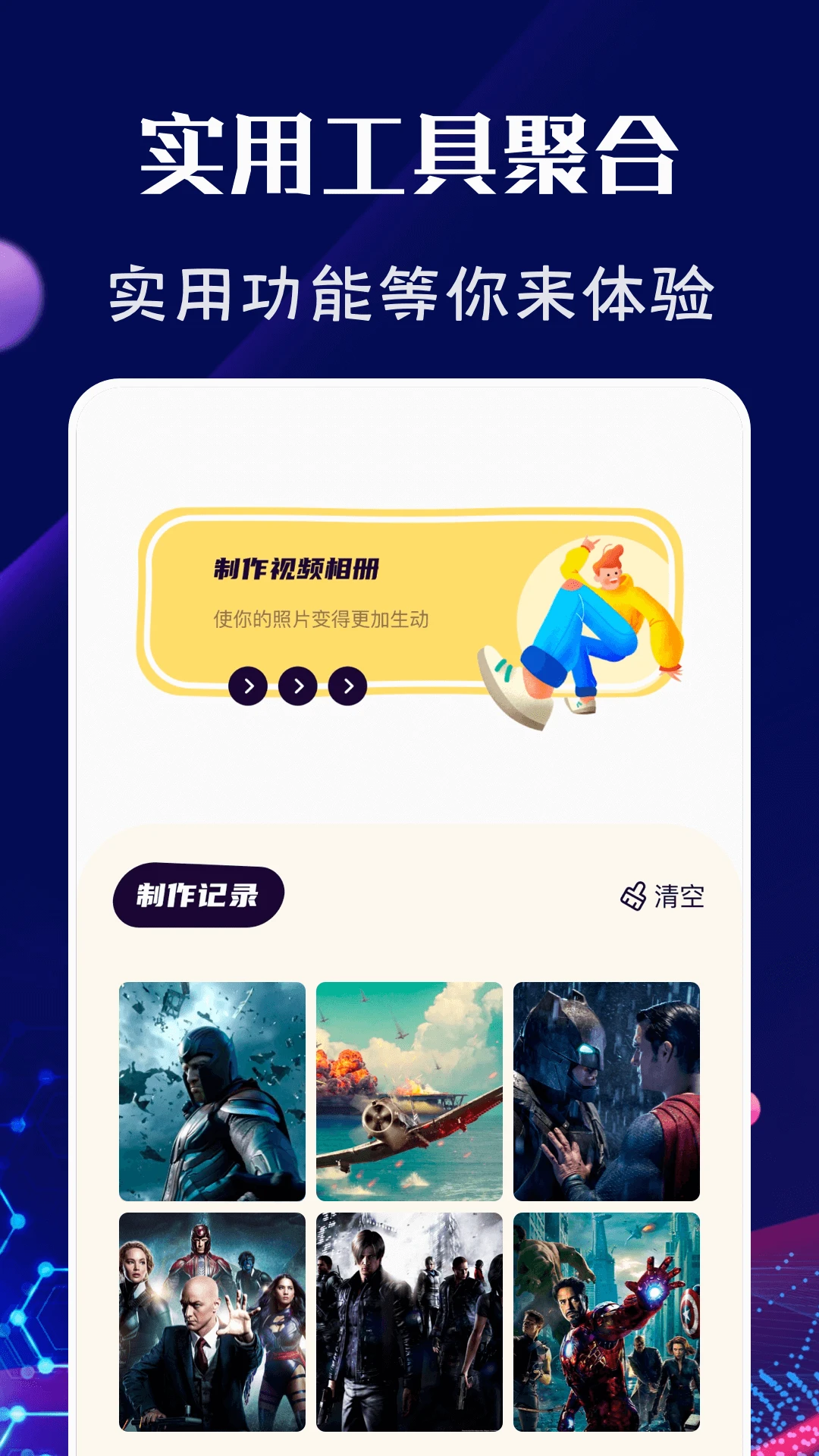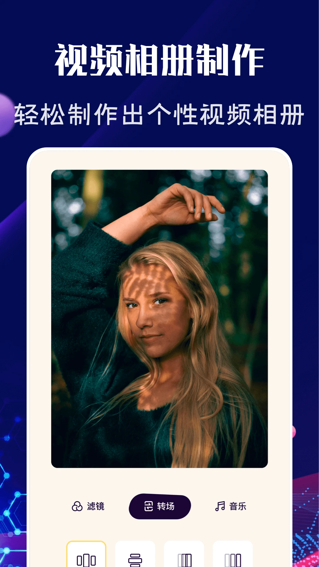 视频相册制作功能,提供多种切换模式和背景音乐选择,轻松制作个性化相册。