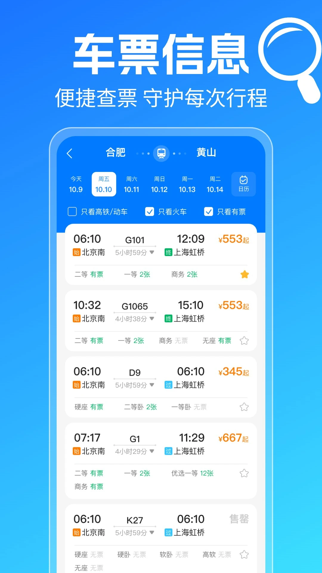 支持汽车、火车、飞机等多种交通工具的票务查询和预订功能,满足不同出行需求。