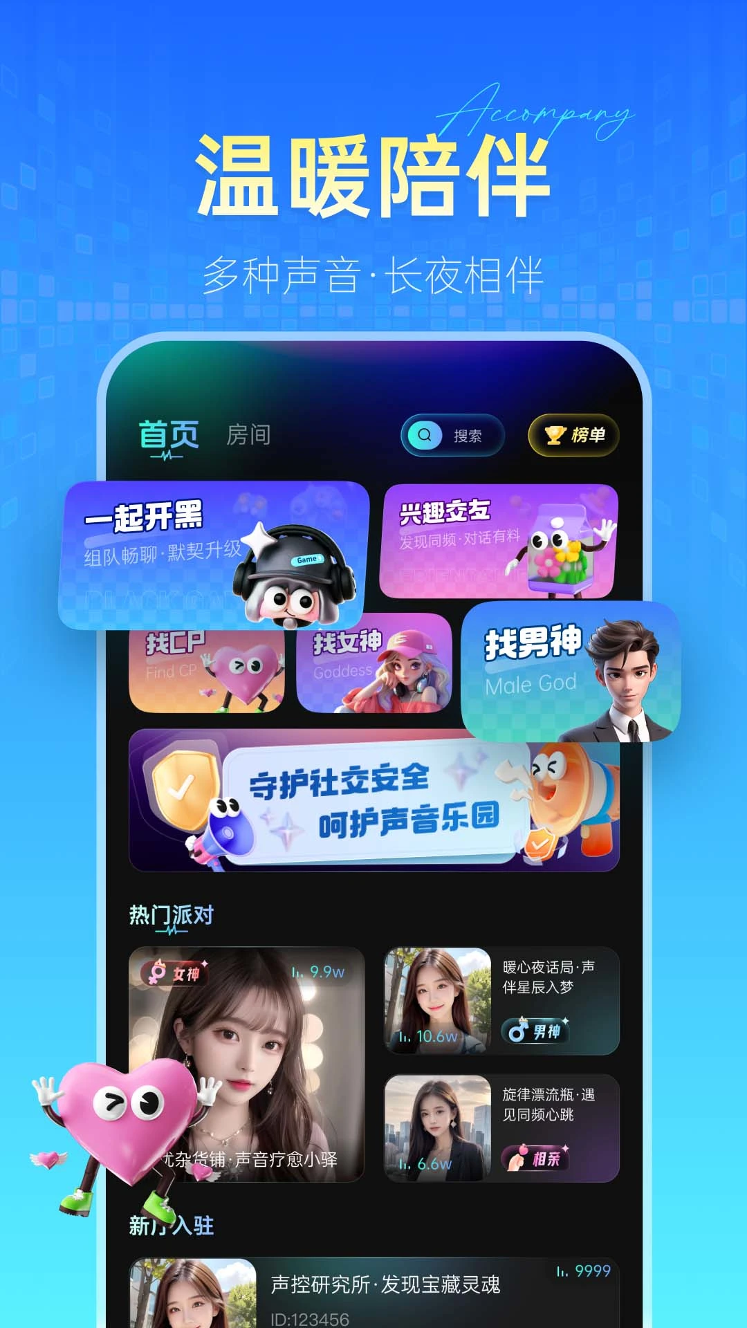 星伴——超燃语音交友APP,邂逅多元声动之旅还在苦恼社交圈太窄?星伴APP闪亮登场,一键开启超嗨语音社交新纪元!畅聊互动:打破隔阂,声音结缘在星伴,多人语音连麦模式火力全开!小哥哥、小姐姐们一同上线,尽情玩游戏、畅快聊生活,全方位领略声音的独特魅力。要是你更偏爱一对一交流,也能找个温柔有趣的Ta,听Ta轻声唱歌,或是畅聊一整晚,排解你的孤独。心动邂逅:主播电台,遇见挚爱主播电台汇聚众多优质声音,风格各异的男生女生应有尽有。在这里,用耳朵感受心动瞬间,锁定那个让你小鹿乱撞的声音,开启浪漫的陪伴之旅。全天候陪伴:暖心相伴,永不打烊无论白天黑夜,开心或是难过,星伴都有一群温暖有趣的小伙伴默默守候。全天候不间断陪伴,让你的每一种情绪都能找到栖息之所。游戏开黑:趣味组队,嗨玩不停热爱游戏的你千万别错过!游戏组队平台。寻找技术超神、幽默风趣的队友,和心仪的Ta携手组队,并肩作战,在游戏世界里收获双倍快乐。卓越体验:高清音质,畅享丝滑星伴打造超高音质体验。让你仿佛与伙伴们面对面交流,沉浸在纯粹的语音社交乐趣之中。