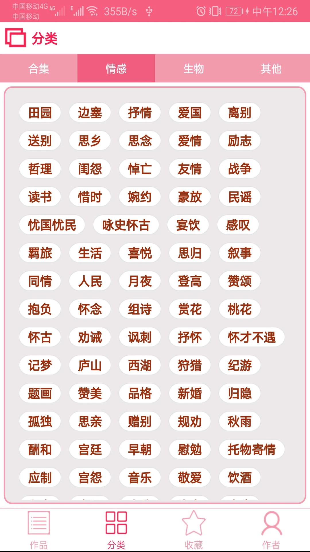 2、分类齐全,各种题材的诗词都有涵盖;