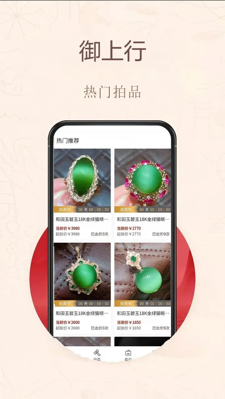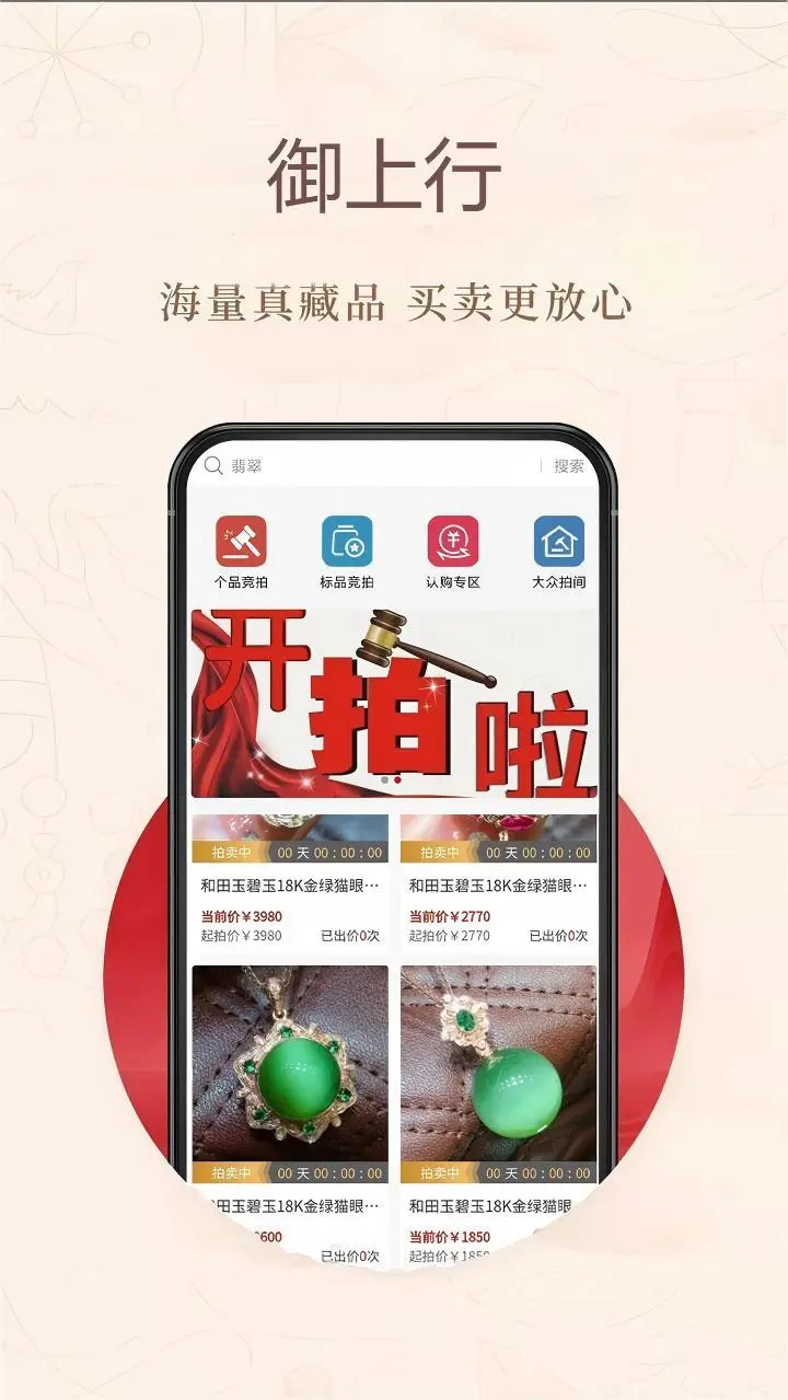 御上行平台是一个专注于珠宝玉石、文化艺术品、大健康产品与地标农副产品的综合性新零售共享生态平台。通过线上线下拍卖、专业品鉴与文化推广的多元结合,平台致力于打破传统商品流通壁垒,让每一位用户都能轻松参与收藏与交易。其核心理念“人人参与”不仅提升了拍卖的趣味性和效益性,更让珍稀藏品走进寻常百姓家,实现“人人可握灵蛇之珠,家家可抱荆山之玉”的收藏愿景。