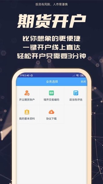 兴业期货App为用户提供极速开户通道,通过智能身份验证和电子签约技术,开户流程仅需几分钟即可完成。系统支持多账户管理,满足不同投资者的多样化需求。