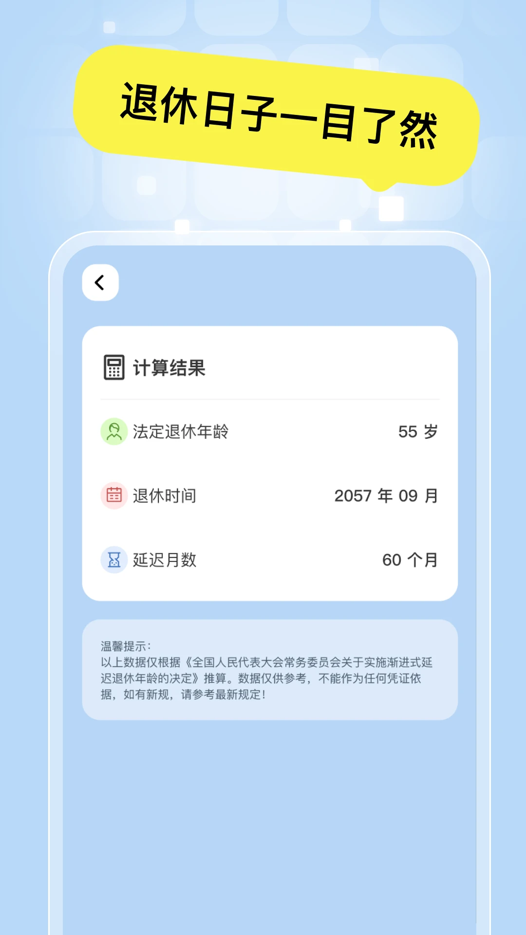 退休结果计算:全能退休计算器能够根据用户输入的出生日期、性别及人员类型等参数,计算出您的法定退休年龄、退休时间,延迟月数,让您对退休后的经济状况有清晰的了解,为您的退休生活做好充分准备。