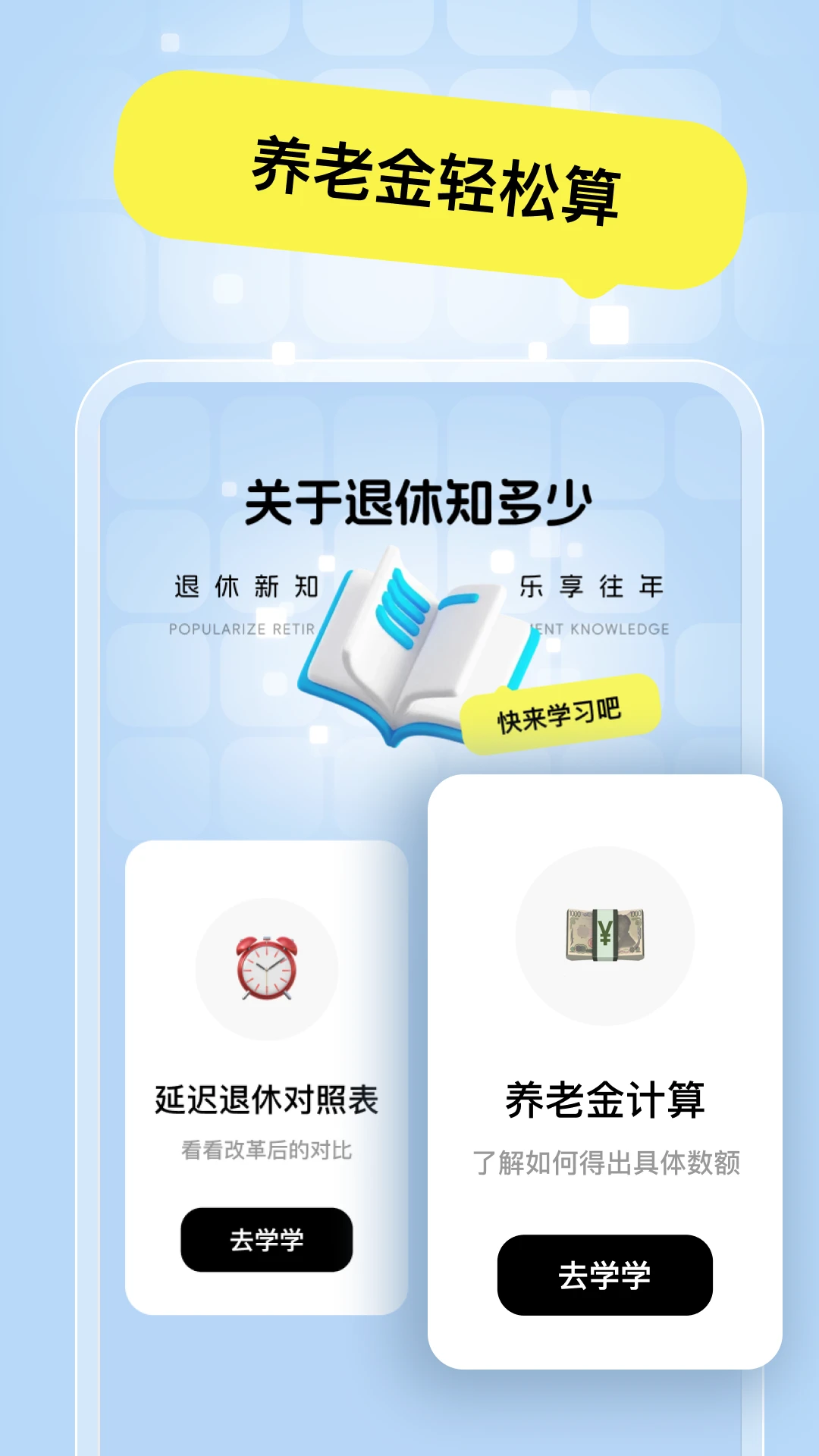 退休知识指南:软件中设有丰富的退休知识库,为您提供实用的退休生活指南。无论是法律政策解读还是日常生活小贴士,都能在这里找到,帮助您更好地规划退休生活,享受无忧晚年。