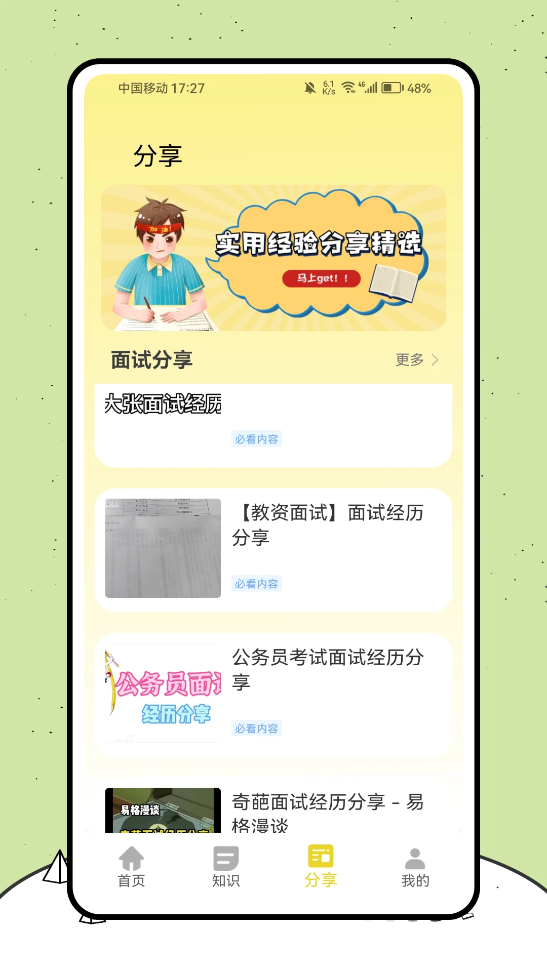 分享栏聚焦实战经验沉淀,面试技巧板块收录结构化面试等题型答题模板、无领导小组讨论话术指南以及考生面试经验谈。