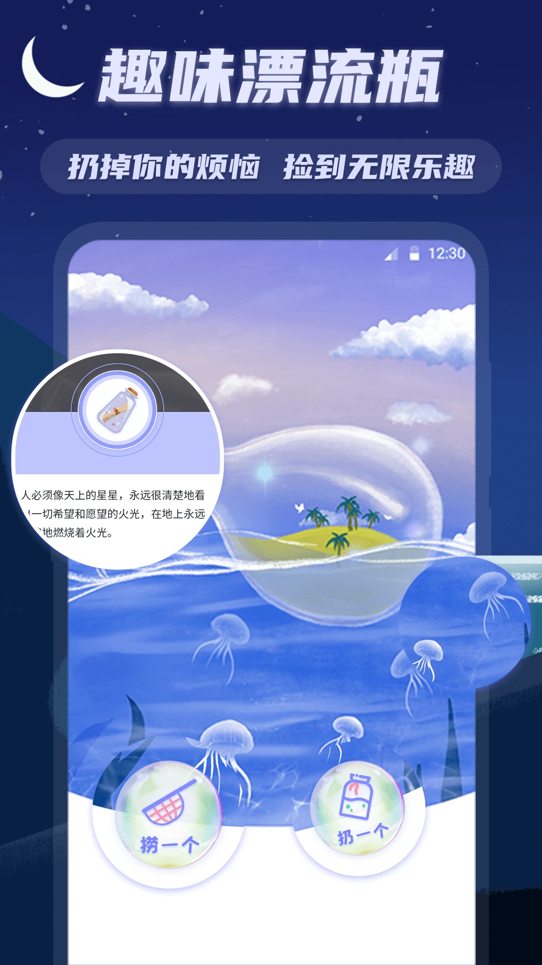 匿名漂流瓶互动:用户可完全匿名地扔出或拾取漂流瓶,打破社交壁垒,无需担心身份暴露。
