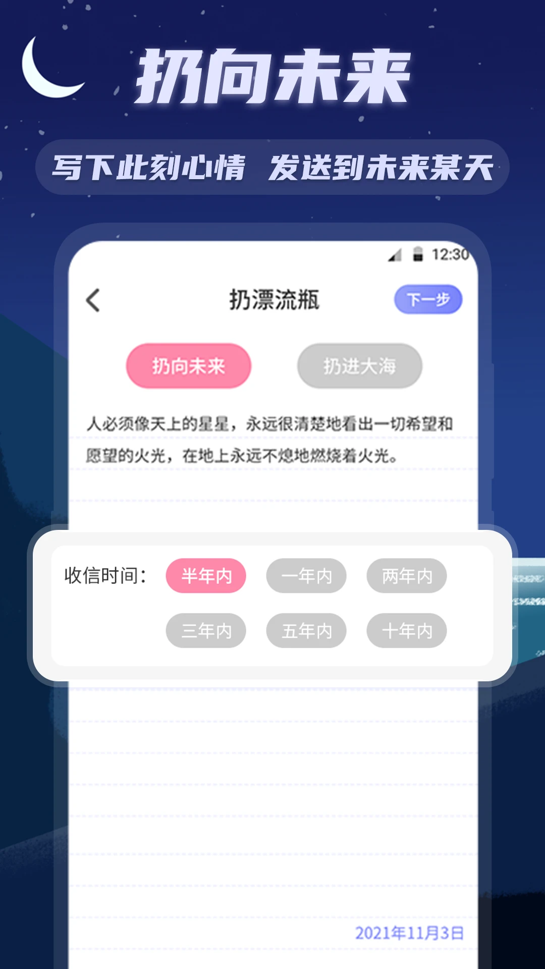 未来重逢功能:独创"飘向未来"机制,系统会随机在未来某个时间将你扔出的瓶子送回,实现与过去自己的对话。