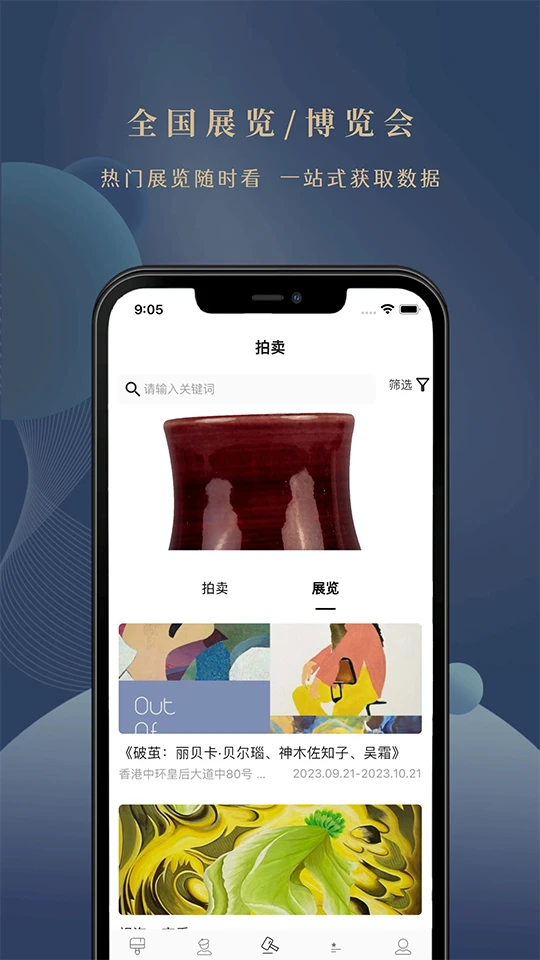 实时拍卖大厅整合全球200+拍卖行数据,提供预展直播与竞价提醒功能