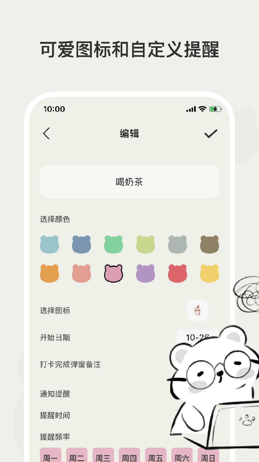 动态小熊反馈:完成打卡后白色小熊变为彩色,通过耳朵计数显示当日完成次数,增强互动趣味性