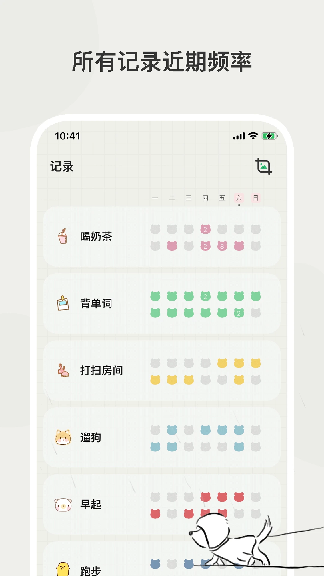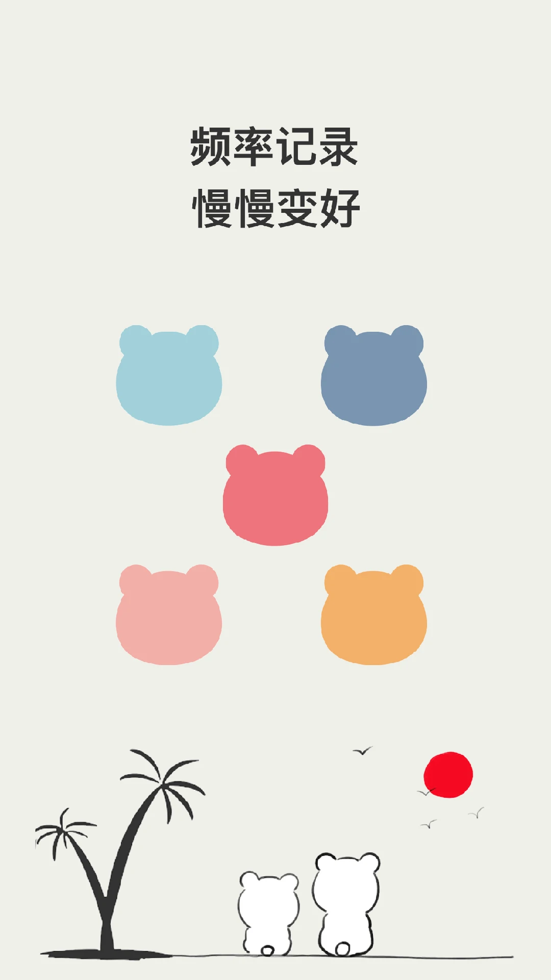 ▣小熊频率是一款记录学习或工作或生活中做某件事的规律的App,用来复盘自己近期的日常,帮助自己变得更好一点。可爱的画风,呆萌的小熊陪伴你成长~▣日常打卡你可以创建自己想要追踪的某件事,比如喝奶茶、背单词、便便、熬夜等,设置喜欢的颜色和小图标,选择记录的起始日期。如果当日完成了这件事,点击白色的小熊,它就会变成彩色啦。当日还可以多次打卡,小熊耳朵会显示当天完成的次数哦。另外,长按还可以进行更多操作哦,比如查看详情、编辑、重置。▣数据查看记录页直观显示你追踪的事情的近两周的全部数据,一眼就看到哪天完成了这件事,完成了几次呢。点击某个追踪项还可以查看更多的详细数据,某个月或者某个年的数据也是一目了然的。▣管理追踪项如果某个追踪事情暂时不想继续追踪了,可以在记录项管理页面先隐藏起来,以后随时再激活,如果彻底不想要了,可以选择删除。