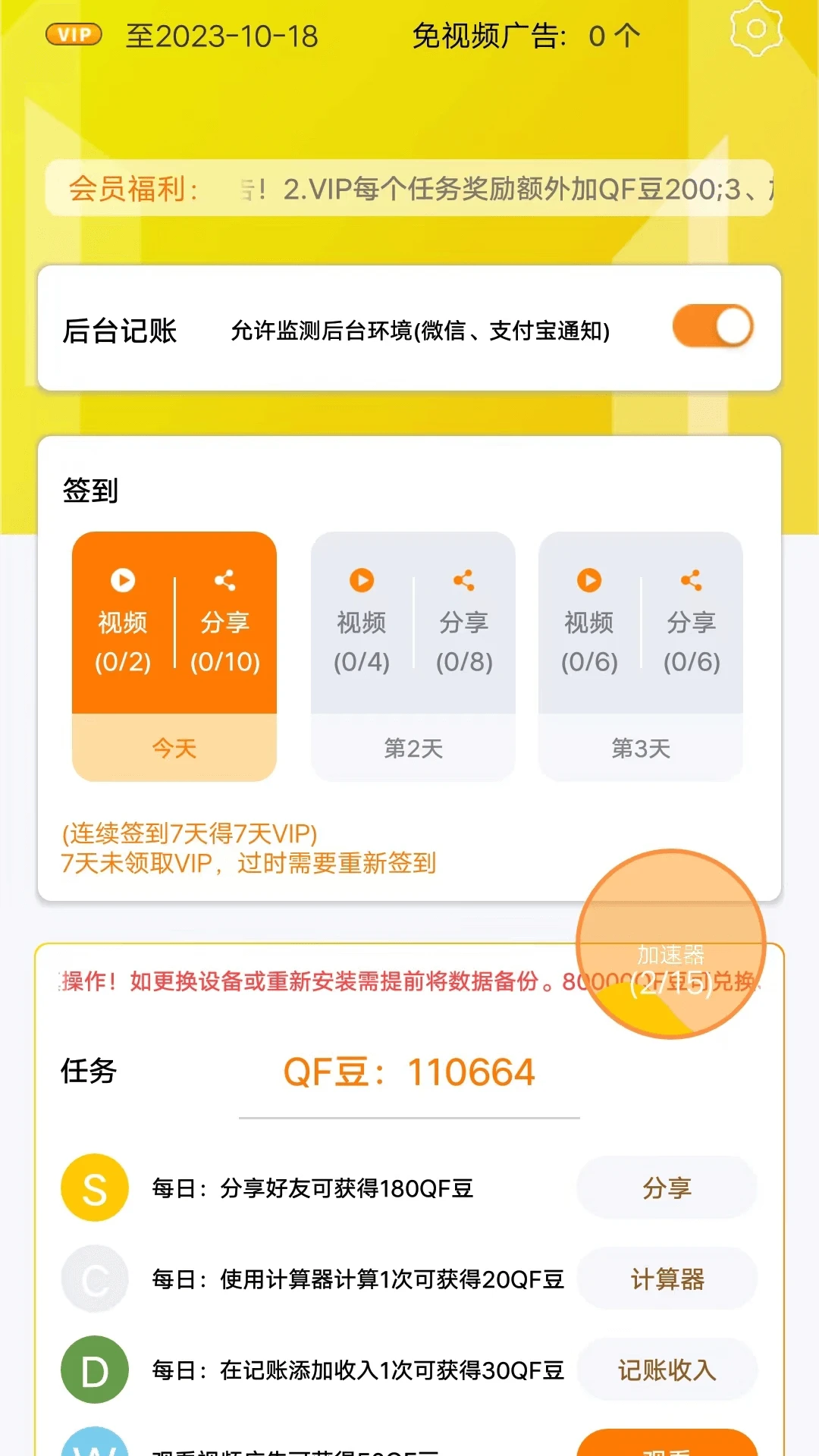 连续签到奖励,坚持7天签到即可获得7天VIP体验,培养良好记账习惯。