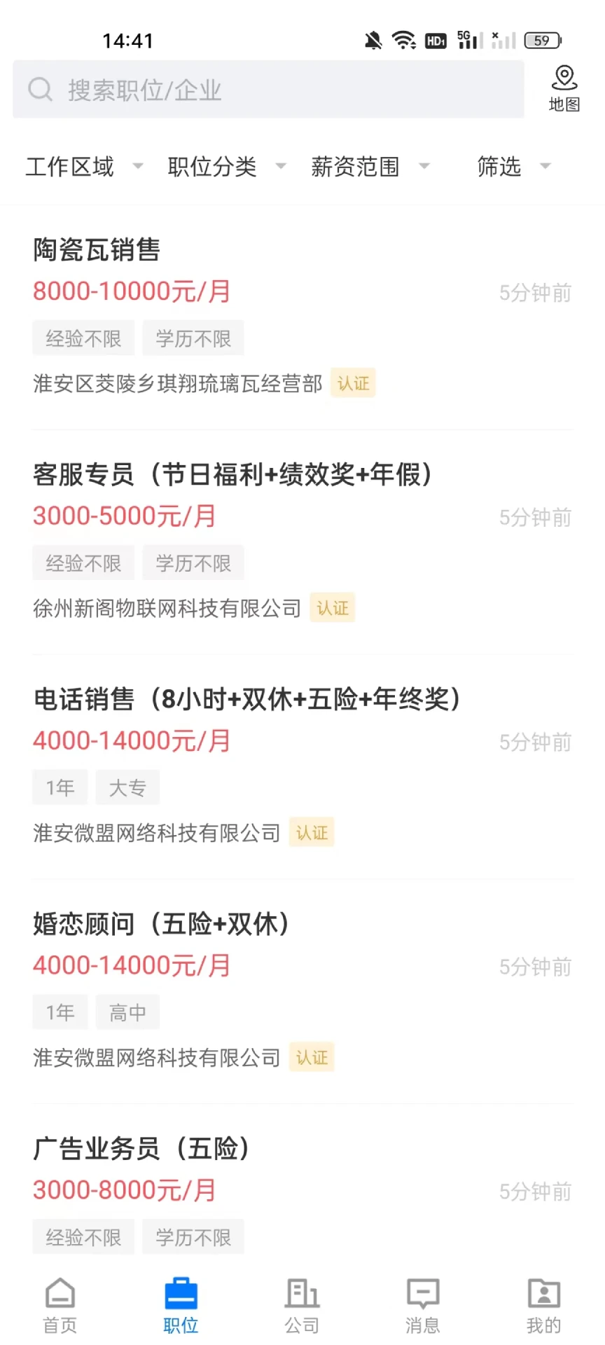 淮安招聘、淮安找工作,就上大淮安直聘!作为淮安微盟网络科技有限责任公司旗下的专业招聘平台,大淮安直聘专注于为求职者和企业搭建高效沟通桥梁。平台汇聚淮安本地优质岗位资源,涵盖各行各业,从基层员工到高端管理职位一应俱全。无论您是应届毕业生、职场新人还是资深专业人士,都能在这里找到适合自己的职业发展机会。同时,企业用户可以通过平台精准发布招聘信息,快速匹配合适人才,大大提升招聘效率。大淮安直聘以用户需求为核心,不断优化服务体验,致力于成为淮安地区最具影响力的招聘服务平台。
