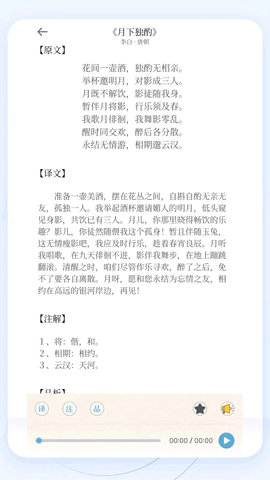 软件采用智能搜索技术,支持按字、按句精准搜索,快速定位关键词,大大提高了查找效率。作为一款完全免费的诗词学习软件,掌上古诗词始终坚持开放共享的理念。详情页面内容丰富,支持同步查看注释、翻译和赏析,为用户提供全方位的阅读体验。