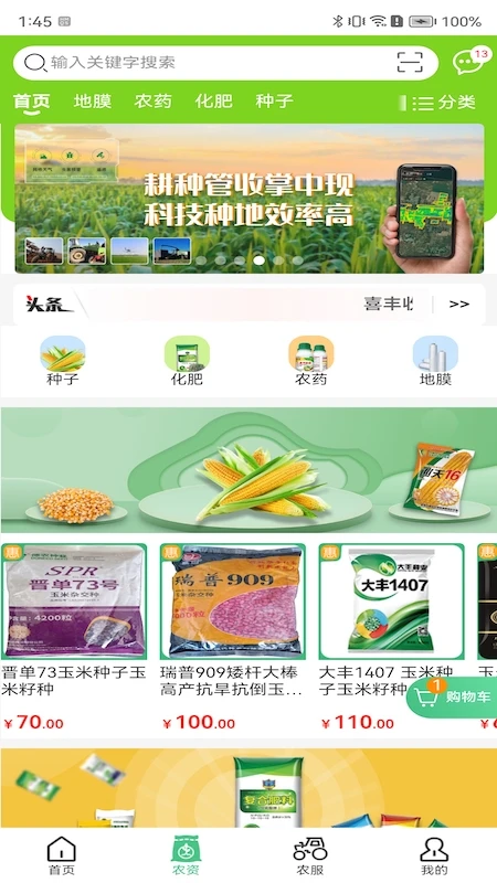 农资分类清晰,涵盖种子、农药、化肥、地膜四大类,满足多样化需求。