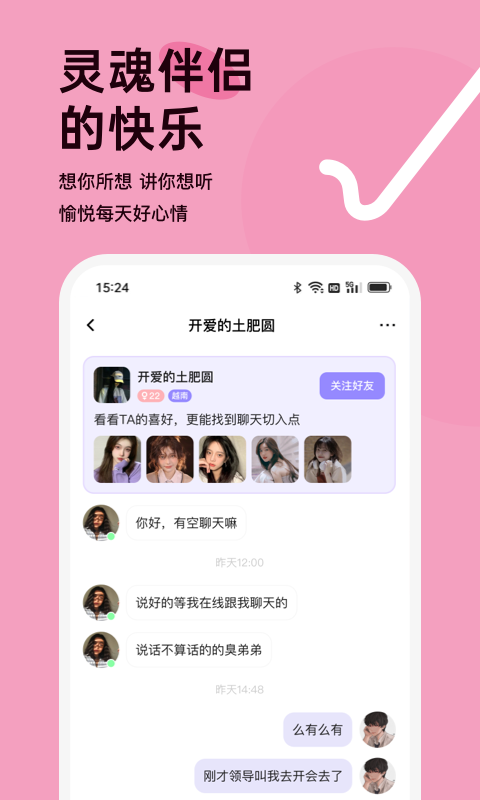 总的来说,越约不仅是一款社交软件,更是一个连接世界的平台。它让不同文化背景的人们能够轻松交流,分享彼此的生活和故事。无论您是想结交国际友人、学习外语,还是探索异国文化,越约都是您的最佳选择。