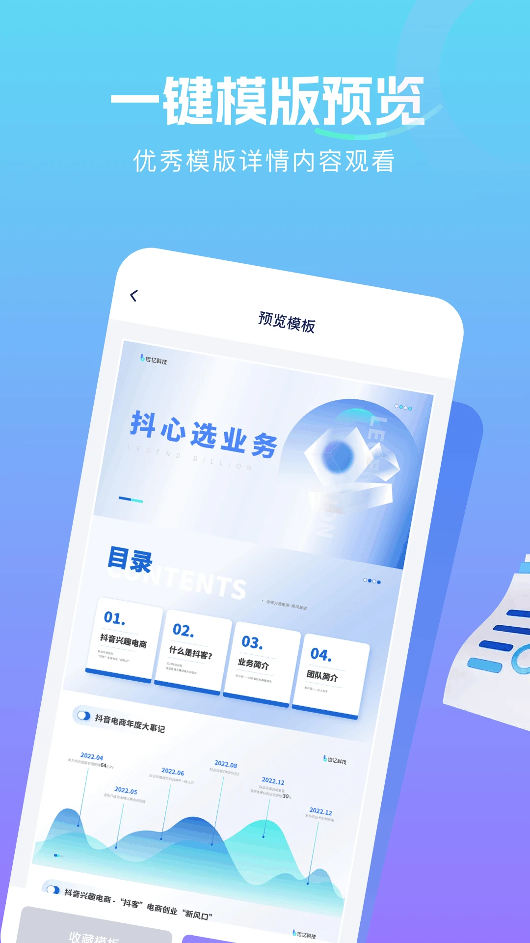 一键模版预览:用户可通过一键操作,快速查看优秀模版详情内容,提前了解模板结构、页面布局、色彩搭配等,方便筛选出最符合需求的模板,提升制作效率。