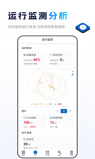 支持实时显示单台塔吊的运行状态,包括力、力矩,幅度、高度、回转、倾斜角度的值;所有数据都以直观的图表形式展示,管理人员可以随时查看塔机的实时工作状态,为决策提供数据支持。