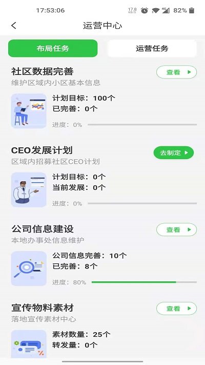 一目了然的运营中心,这里设置了布局任务和运营任务标签,展示清晰的任务列表,支持任务进度追踪和团队协作。