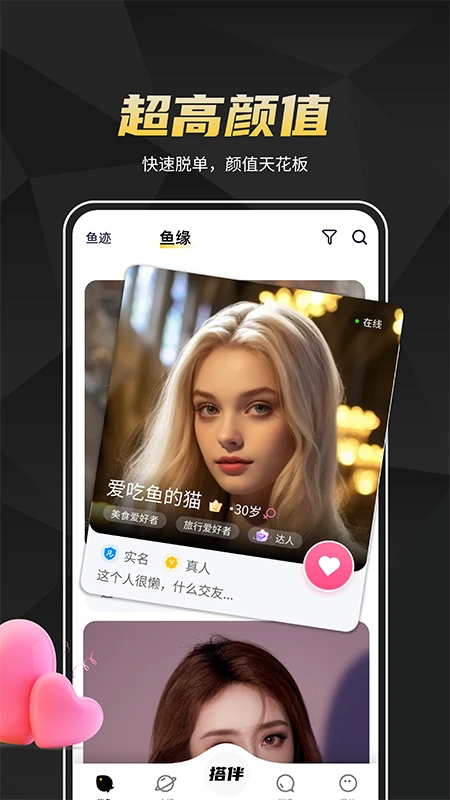 伴鱼是一款专注于同城线下社交的交友平台,致力于为用户打造真实、有趣的社交体验。通过智能匹配和即时互动功能,伴鱼帮助用户快速找到志同道合的"搭子",无论是交友、恋爱还是组局活动,都能轻松实现。平台以动态广场和同城找搭子为核心功能,让用户随时随地分享生活、发现身边有趣的灵魂,重新定义陌生人社交的新方式。