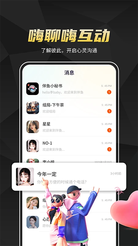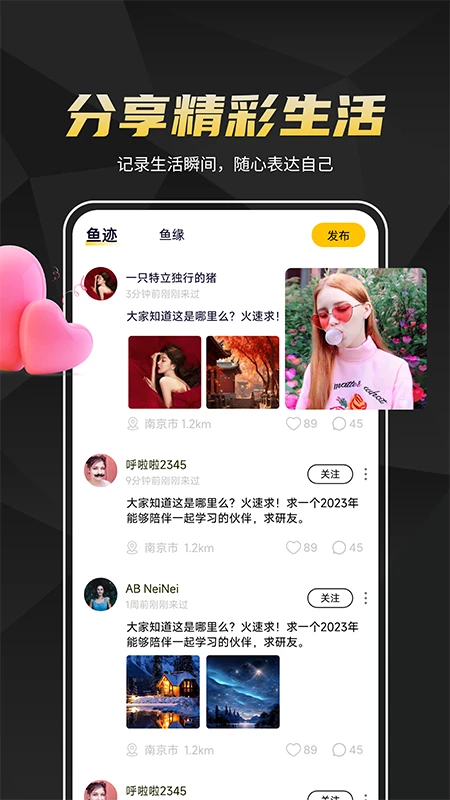 同城附近人约伴,就上伴鱼一起组局搭伴~【伴鱼】是一个全新社交玩法交友体验的搭子社交平台,让社交回归线下,集交友、恋爱、社交、搭伴于一身。解决陌生人的真实交友互动平台,发现好玩又有趣的社交新世界!特色功能介绍:【精准匹配】同城神秘缘分,智能匹配,精准交友【即时互动】视频语音互动,真人聊天交友,了解彼此,开启心灵沟通【同城找搭子】遇见同好,寻找身边的"搭子"【动态广场】记录分享精彩生活,随时随地,可随心表达自己探寻身边有趣的灵魂!快速遇见同好玩伴,寻找搭伴和交友,一起找搭子