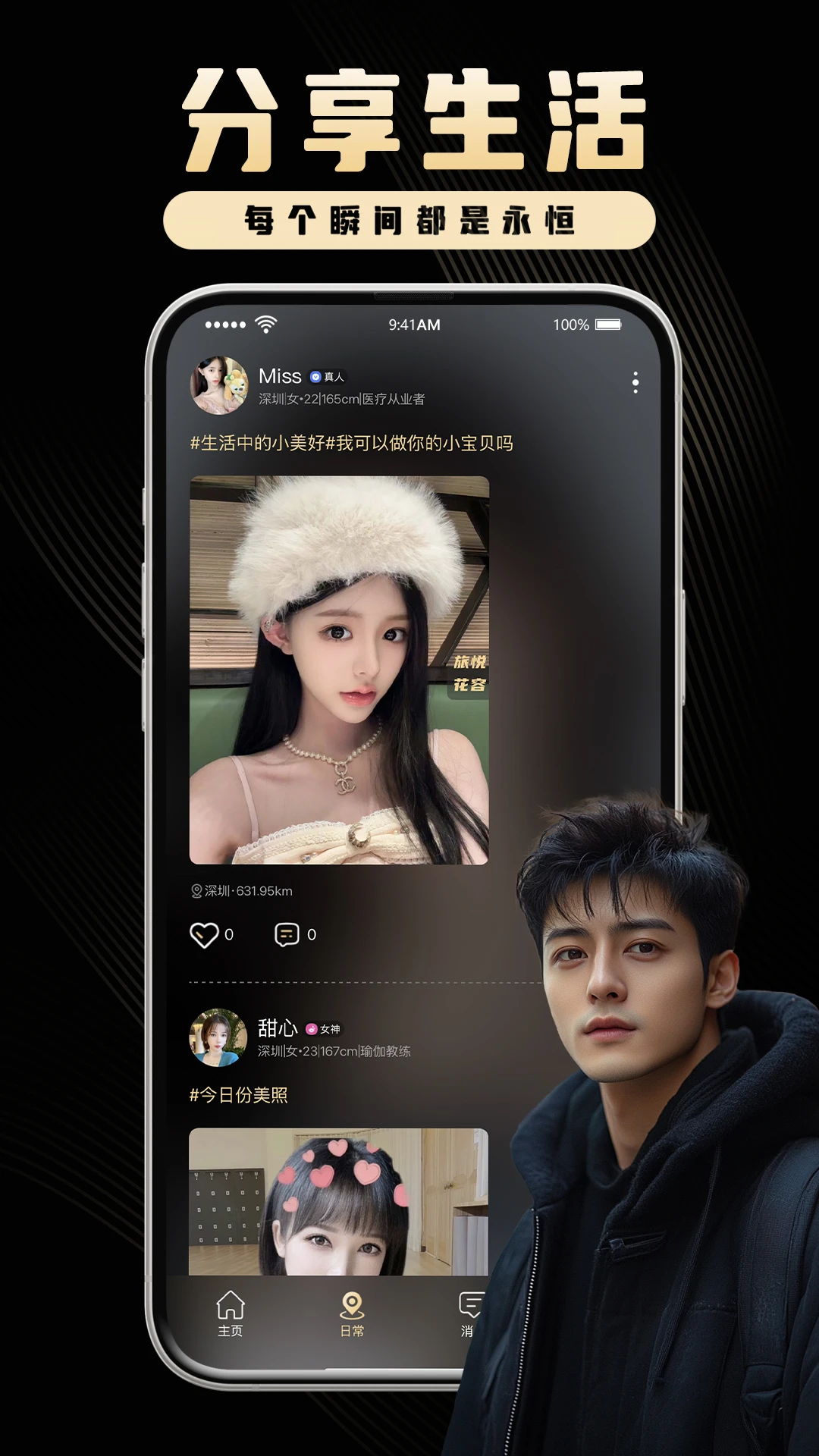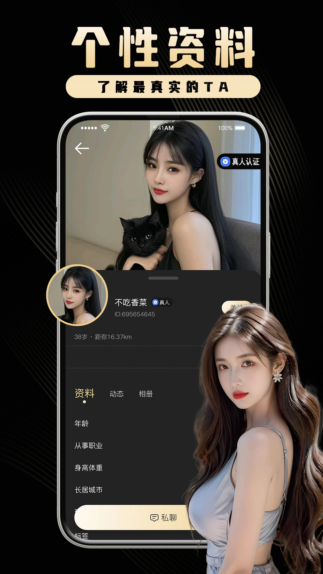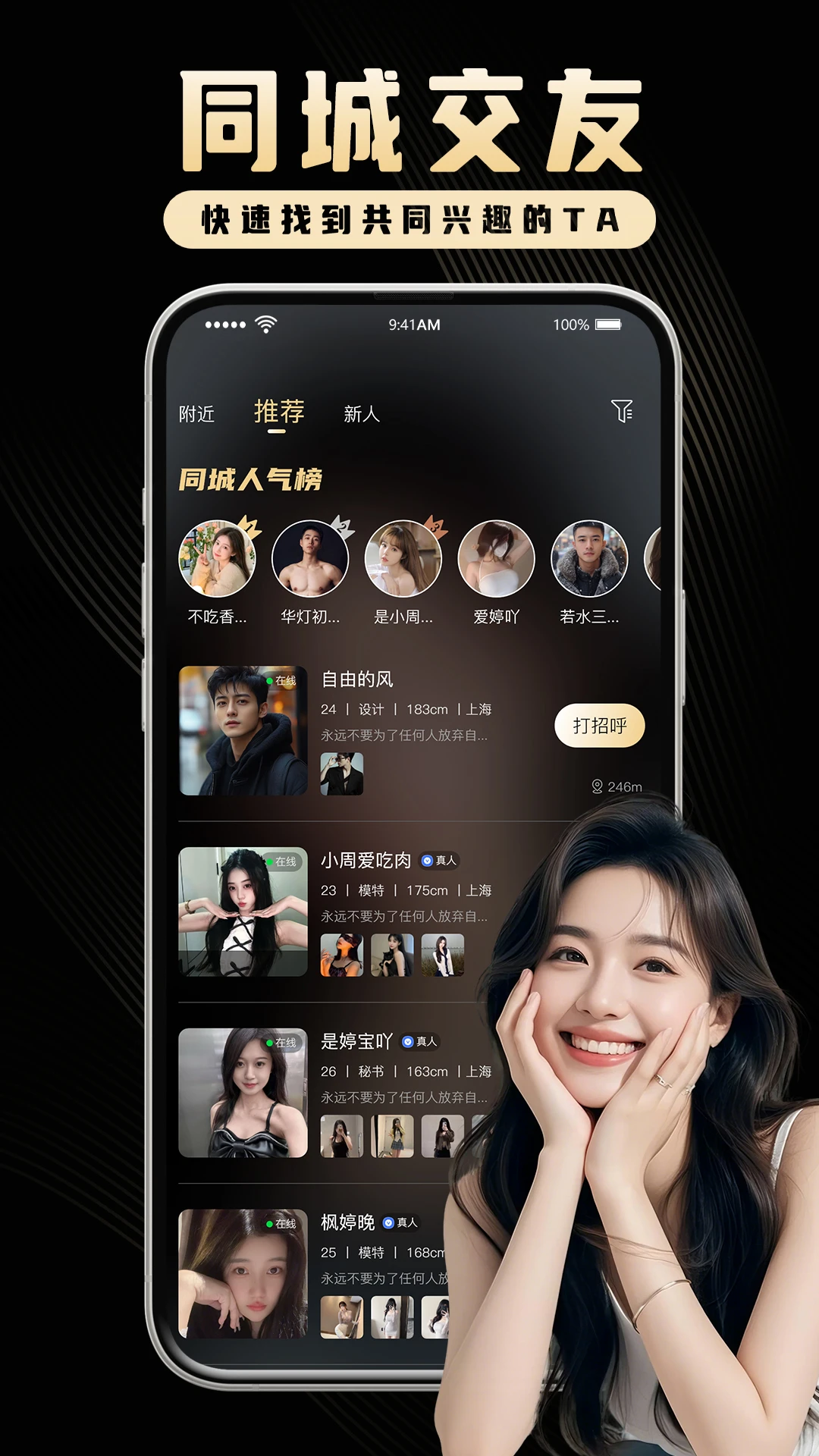 【产品特色】高颜值优质小姐姐帅气的男士注册使用【多重认证】视频人脸认证,人工实时参与,3层严格审核确保用户真实靠谱【推荐附近】同城匹配,高效锁定在线的TA,快速约见