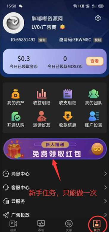 新人第一次登录点我的,点免费领红包,完成相应任务可以领取1金币,价值1USDT。平台还设有新手引导教程,帮助用户快速上手