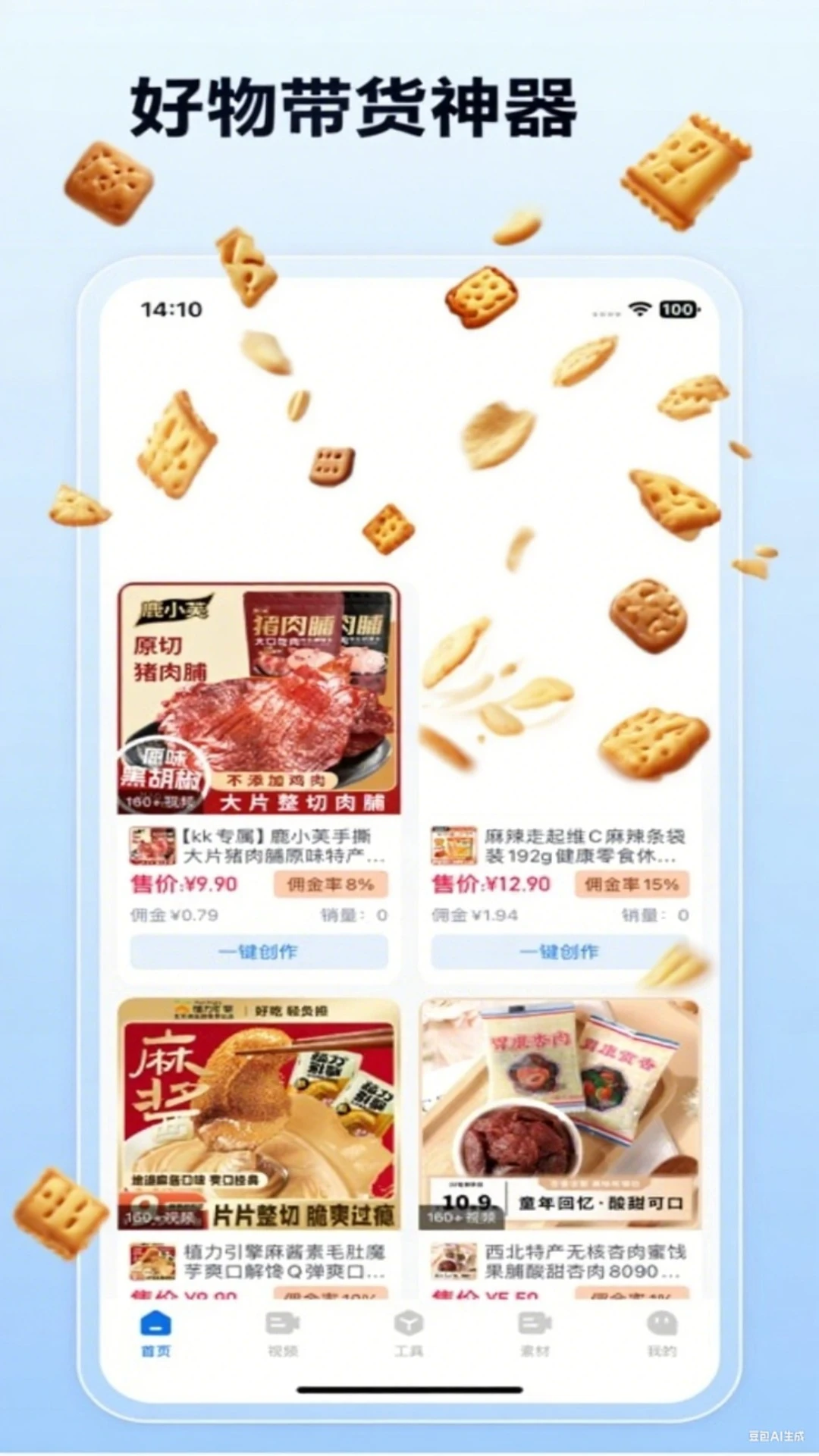 带货神器,为达人提供一站式带货创作解决方案,包含海量免费原创高清素材和图片视频处理工具,是带货达人的得力助手,轻松制作高质量的带货作品,无论是选品、拍摄、配图还是配音,都能一键完成,让制作变得更加简单高效。对接了上千个商品源头,不需要买样品一个个拍摄,直接选择带货品类,挂车就可以带货。