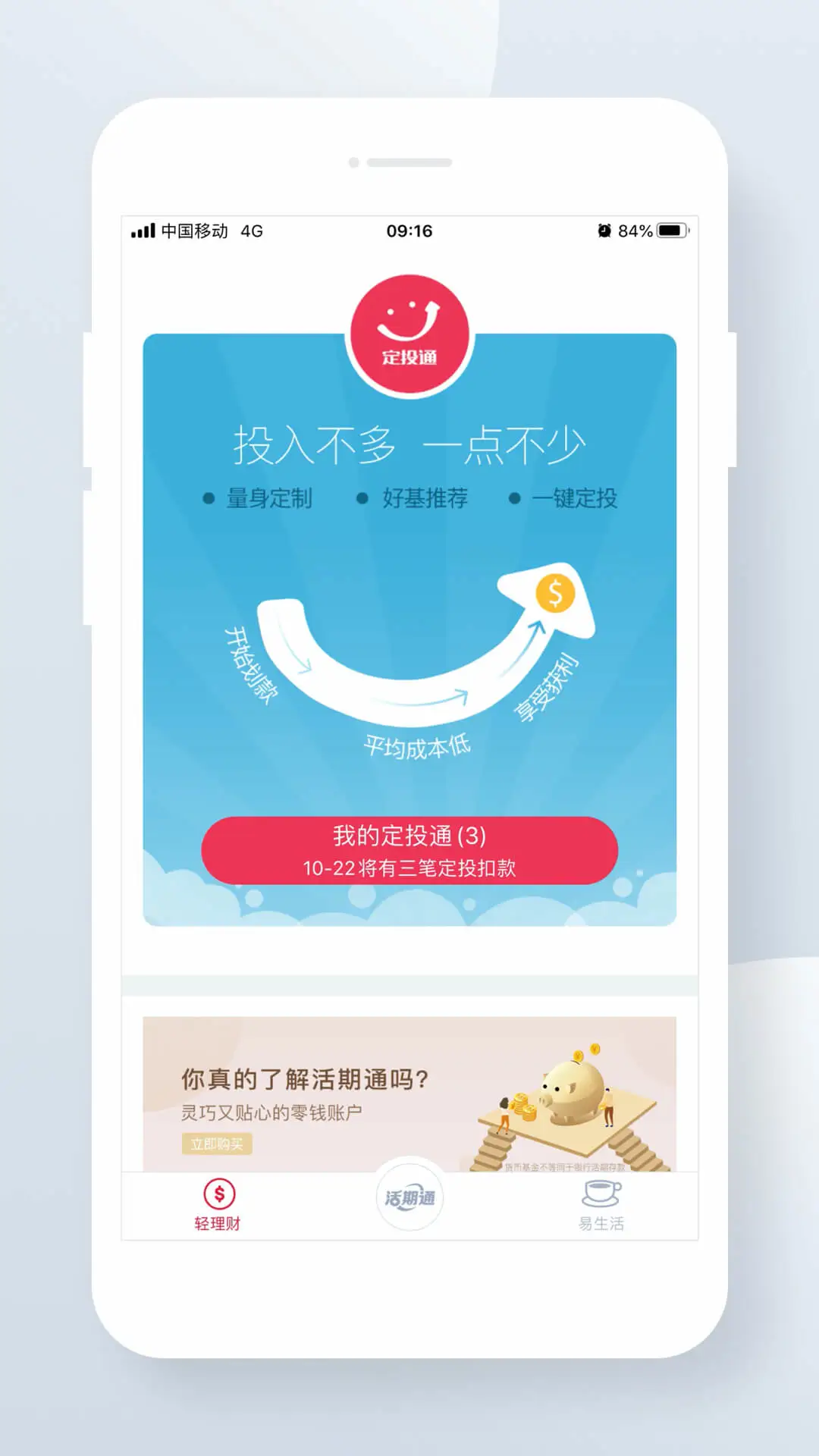 定投通:聪明而高效的定投服务,一键设置即可为您定时买入基金产品。