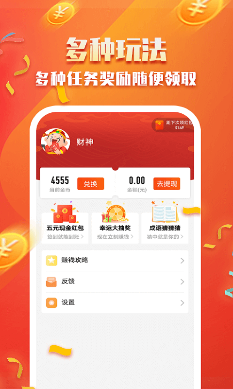 新用户首次登陆立即赠送1000金币奖励,首页内每天还可以免费领取金币,金币可兑换现金,立即入账。连续签到还能获得额外奖励,7天签到更有惊喜大礼包。邀请好友注册双方都可获得丰厚奖励,让赚钱变得更容易。